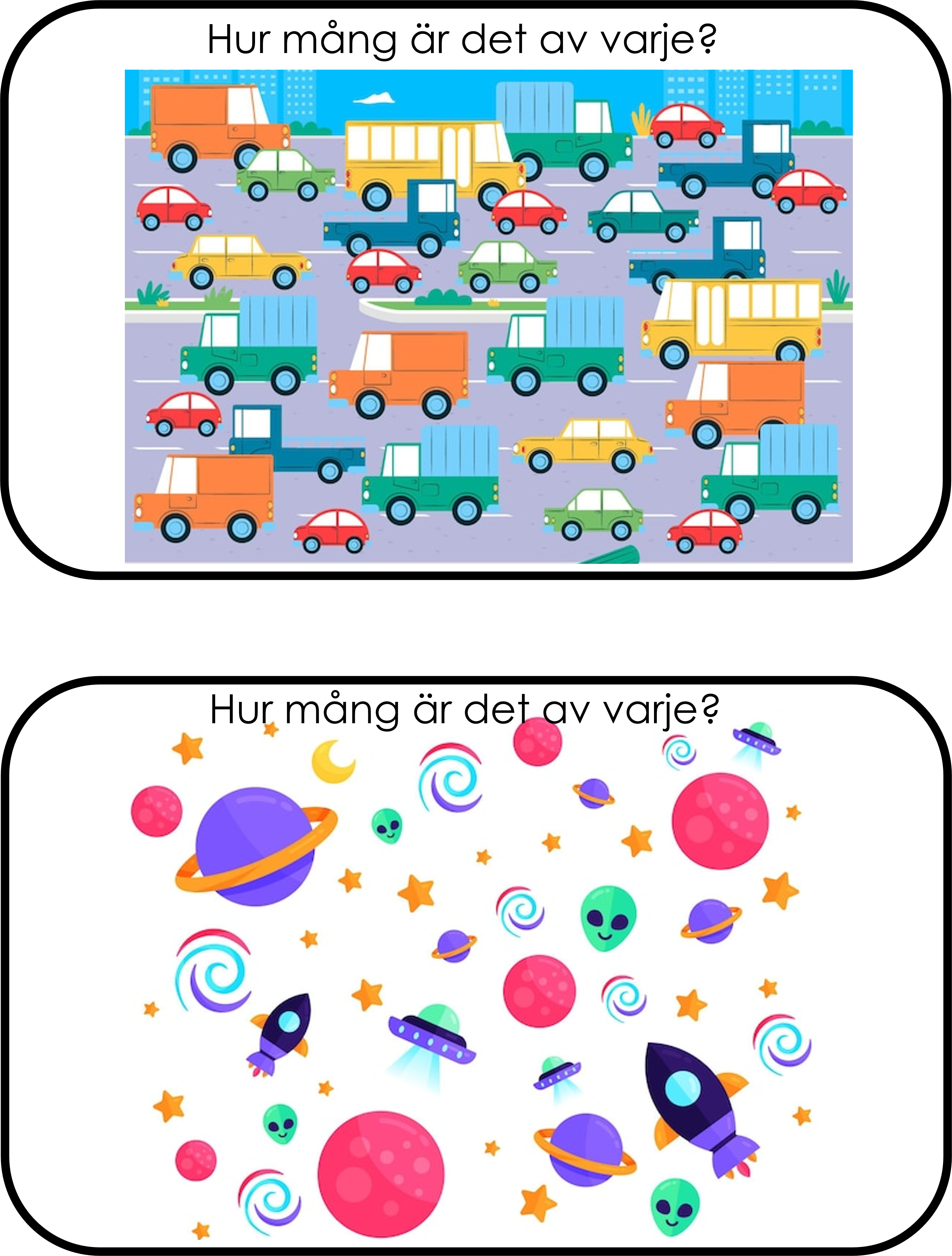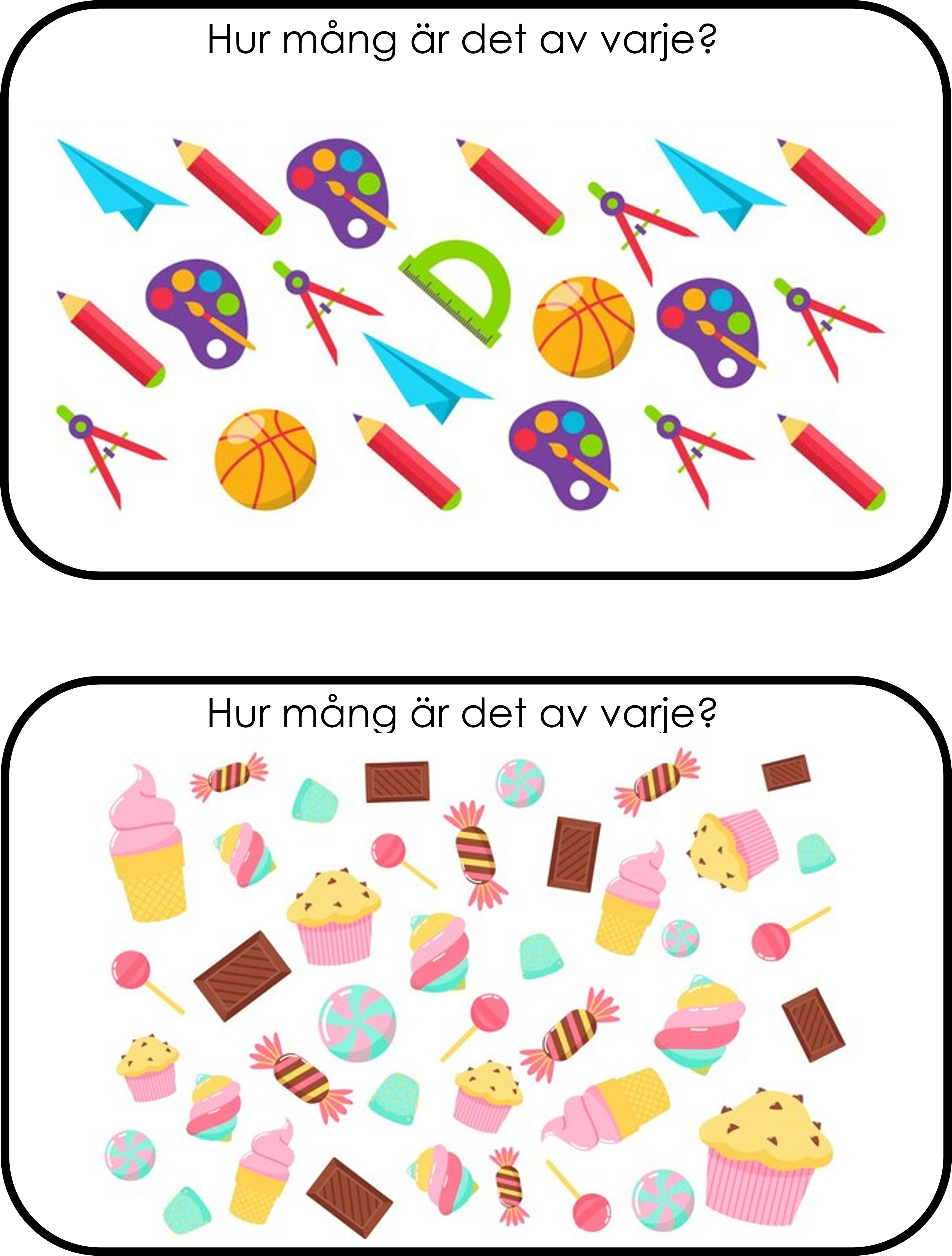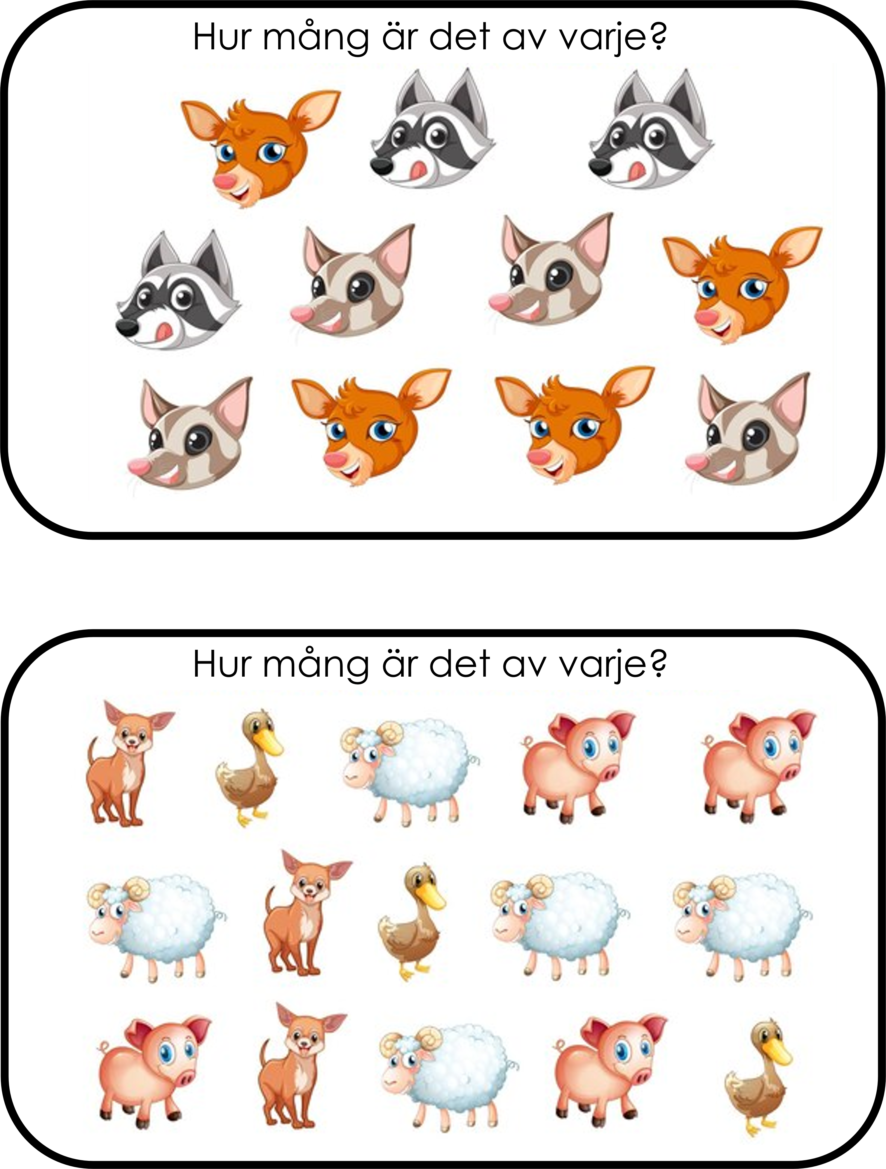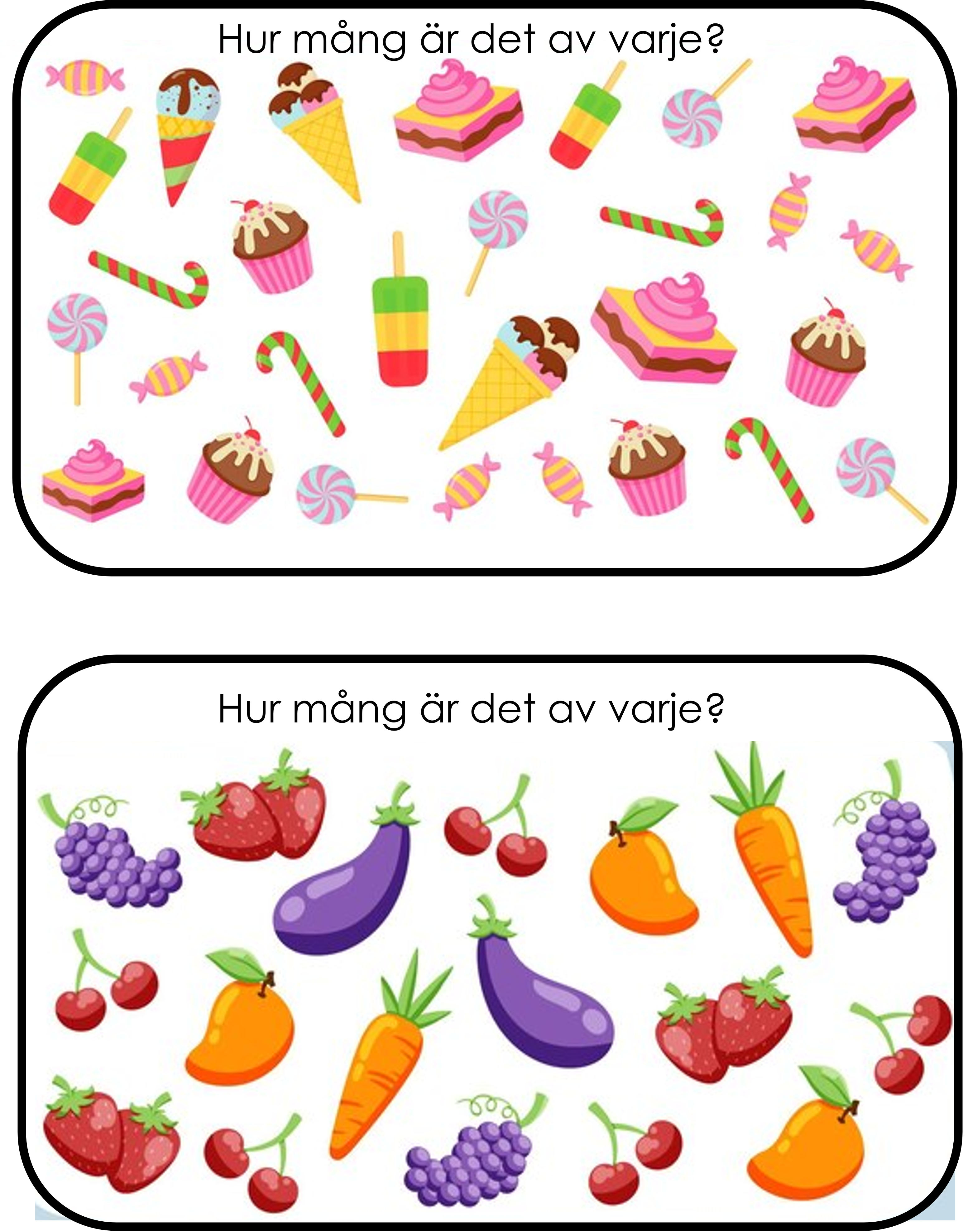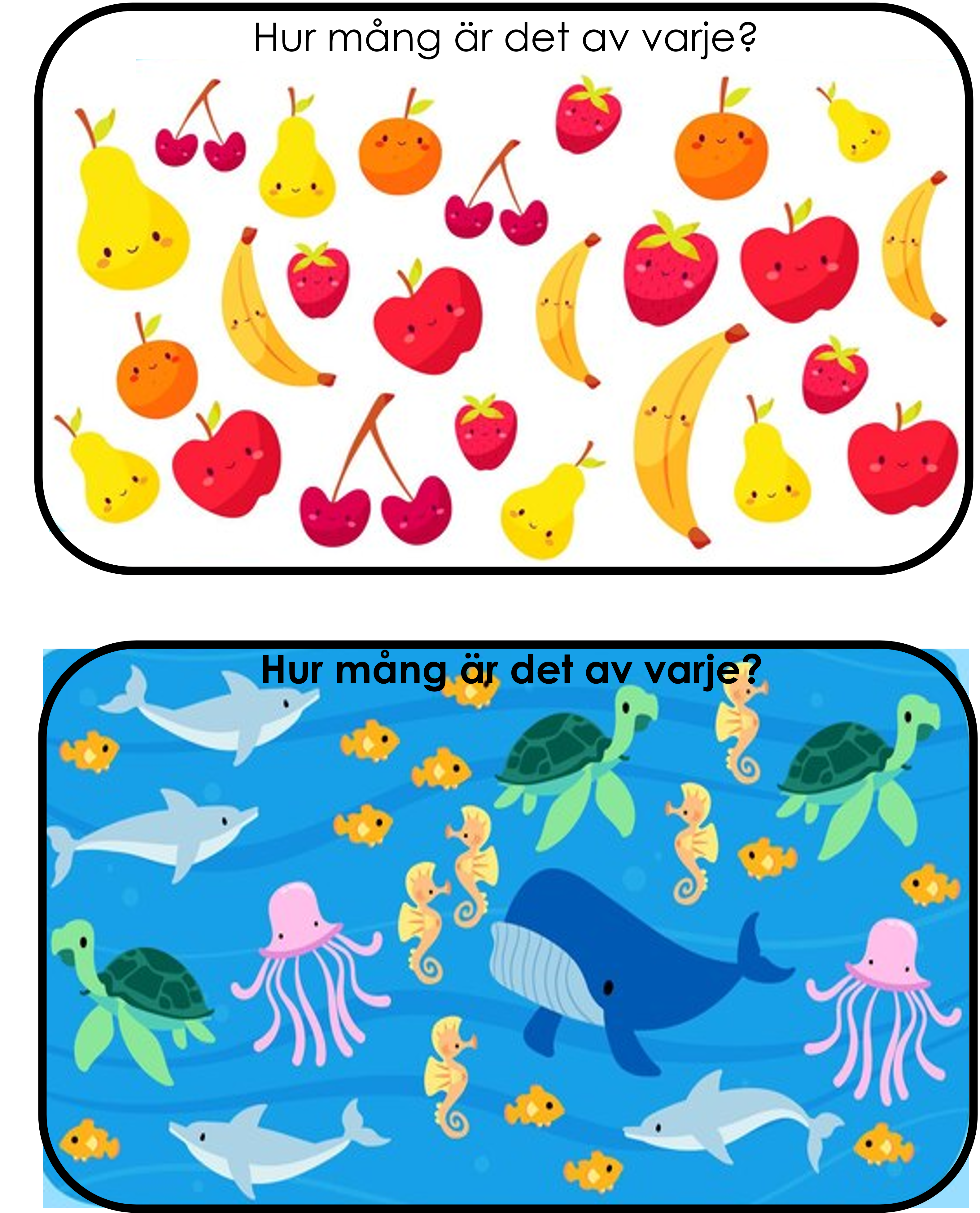 Ett matematiskt materiel med frågan Hur många är det av varje?. Detta kan man använda som samarbetsövning eller som en startuppgift eller så har man det i en barngrupp och samtalar kring bilden och så får varje barn vara en frukt/djur och räkna hur många det är. Man kan även lägga till sifferkort så kan barnet ta upp rätt kort.