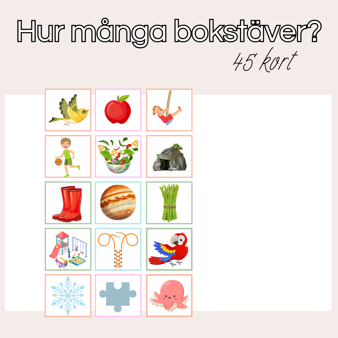 Låt eleverna ensamma eller tillsammans hitta hur många bokstäver som finns i ordet. Ett material att eleverna ska komma fram till hur många bokstäver som finns i ordet.