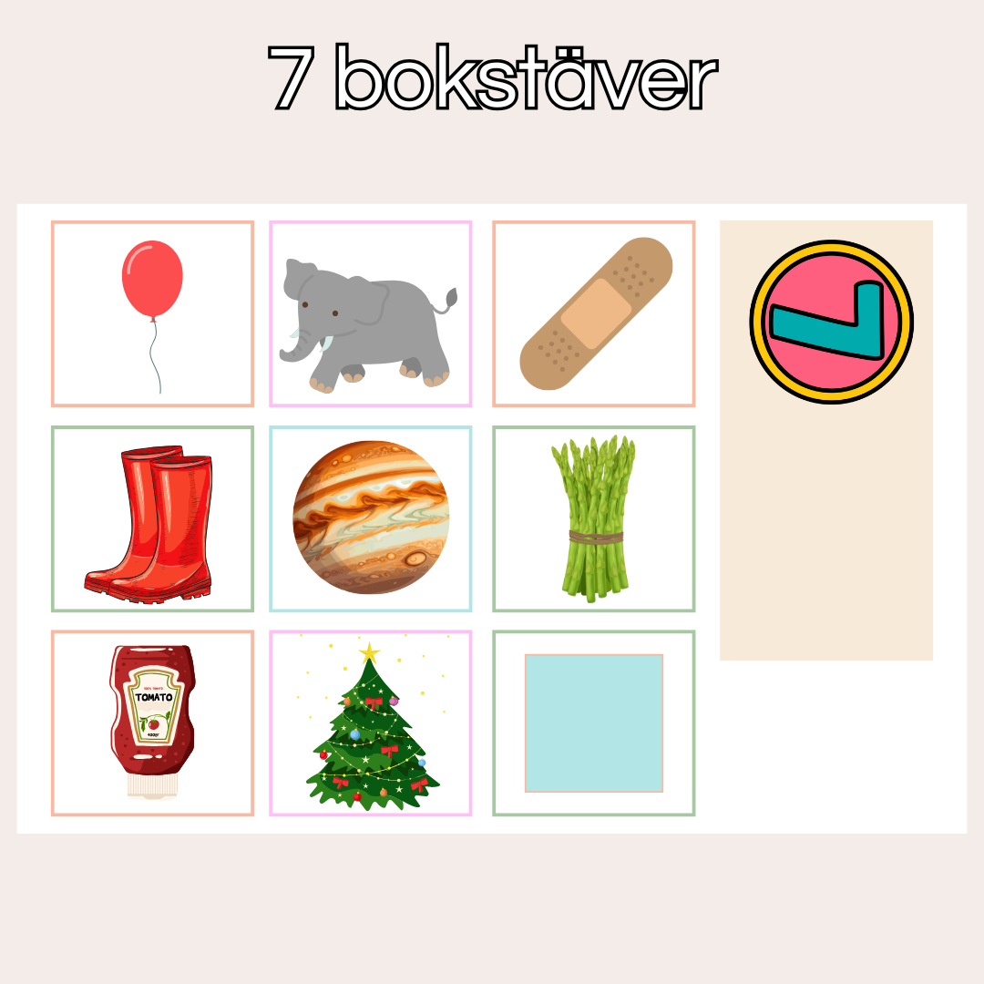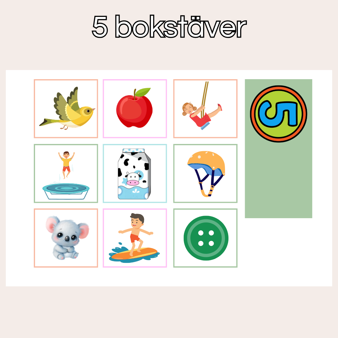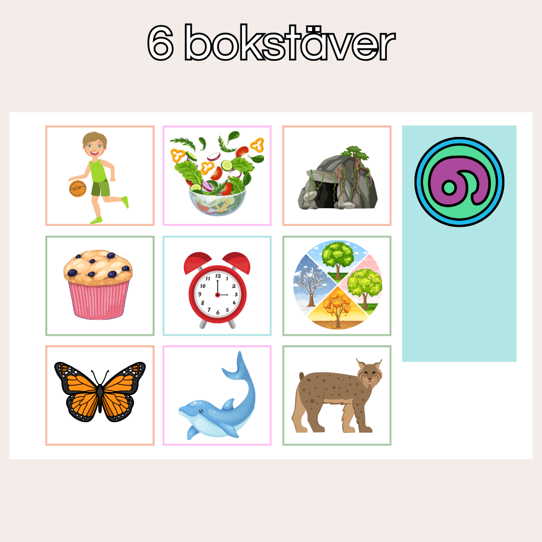 I materialet finns ord med 5,6,7,8,9 bokstäver och till varje antal bokstäver finns det 9 ordbilder.
