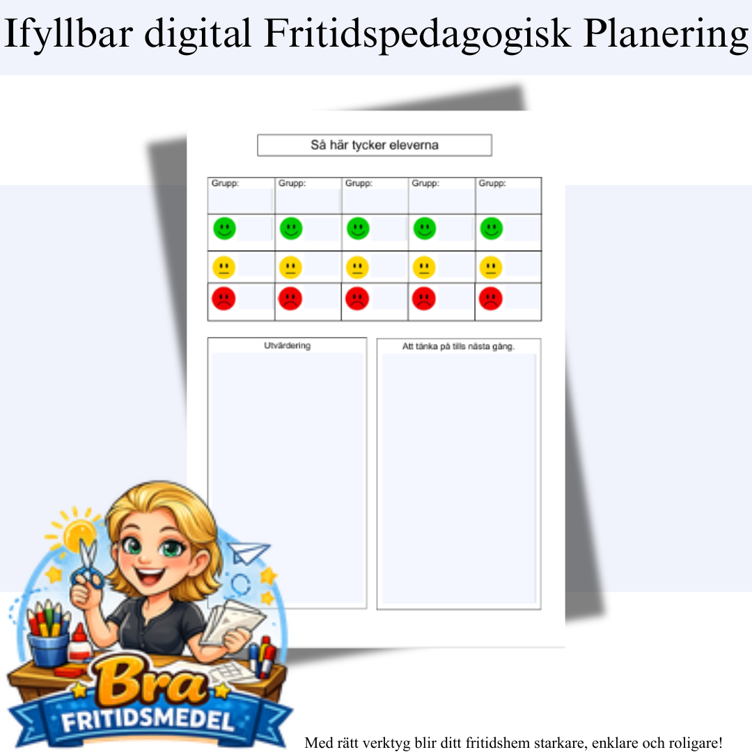 Säg hej då till rörig planering och tidskrävande dokumentation. Med denna ifyllbara digitala planeringsmall får du ett smart, enkelt och professionellt verktyg som hjälper dig att planera fritidshemmets aktiviteter på nolltid – med kvaliteten i fokus.