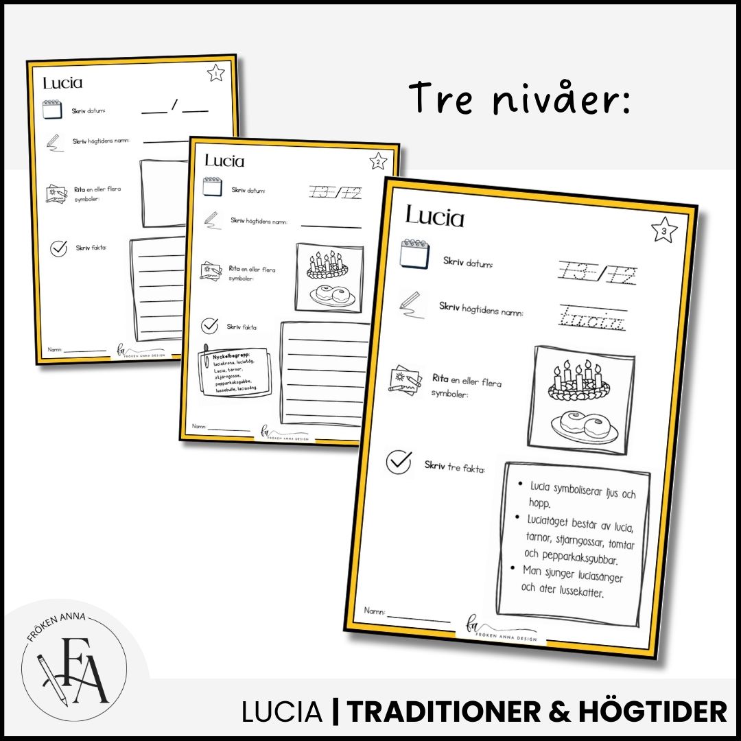 - Uppgifter som att skriva datum, rita luciasymboler och skriva fakta om Lucia.