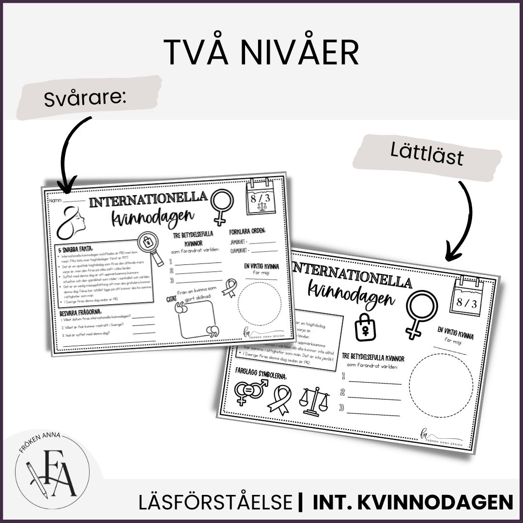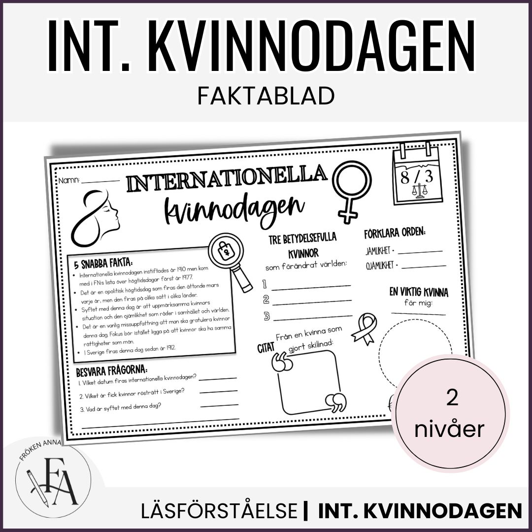 Läs & Lär om internationella kvinnodagen, besvara frågorna och färglägg. Skriv med fördel ut i A3.