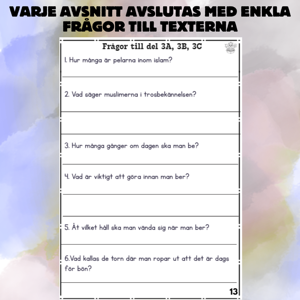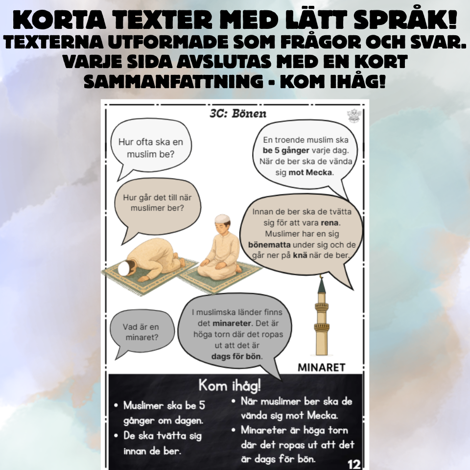 Arbetshäfte med korta och enkla texter och lätta uppgifter till texterna om islam. Texterna och uppgifterna är anpassade för elever som behöver extra stöd och hjälp i skolan. Texterna är utformade som elevers frågor och lärares svar till frågorna. På varje sida med text finns en kort sammanfattning av innehållet. Det finns gott om bildstöd knutna till ord och texter för att underlätta förståelsen. Till varje avsnitt finns enkla frågor och en uppgift där eleverna ska dra streck mellan ord och bild, sant eller falskt frågor eller uppgift med ordluckor. Materialet avslutas med en ordgömma och ett quiz för att kontrollera elevernas kunskaper. Dessutom finns det en ordlista (med en del bilder) till alla svåra begrepp i texterna. Materialet innehåller också ett tydligt facit till alla uppgifter. Ett mycket uppskattat material för de elever som har svårt att klara av skolans läromedel.
