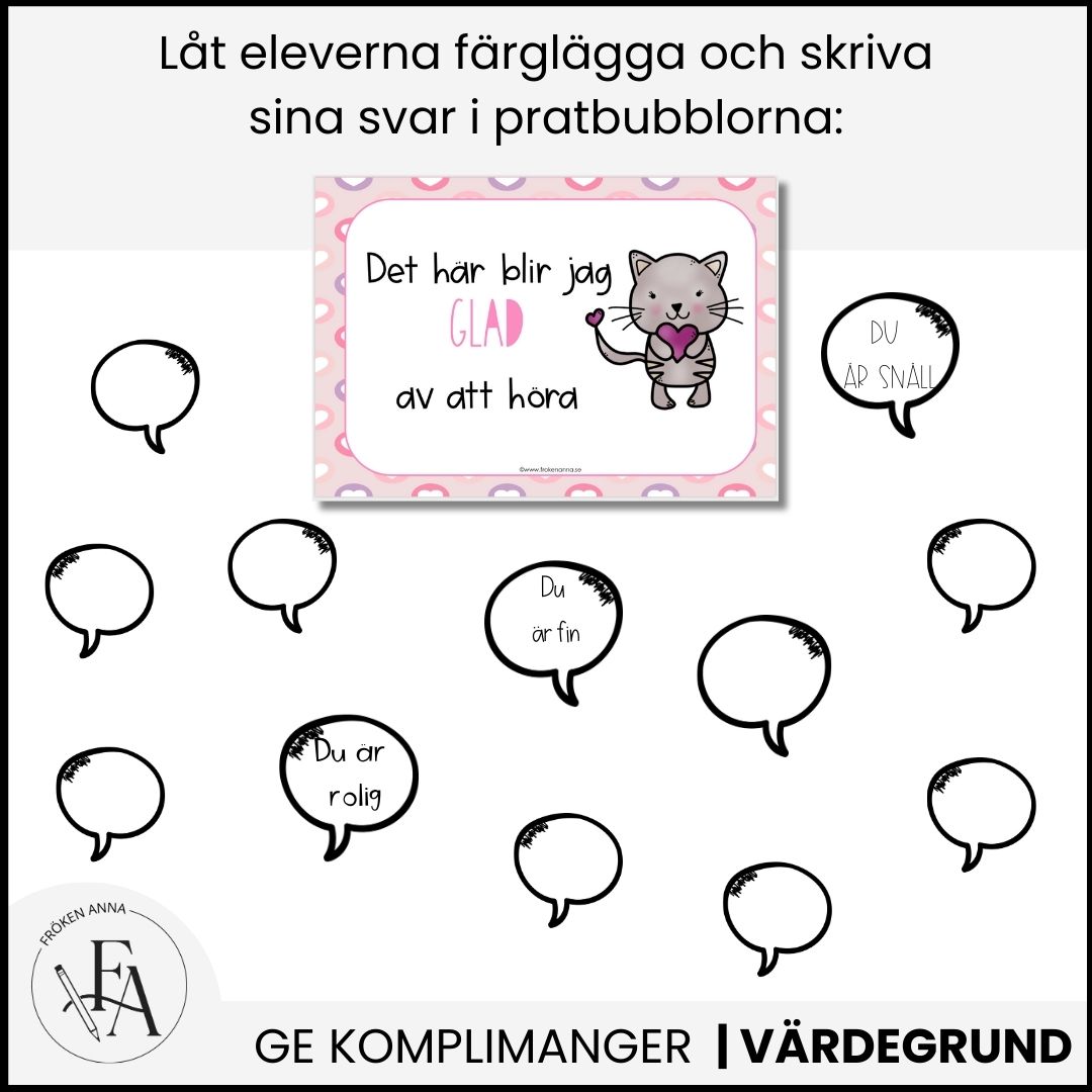 Låt alla elever skriva ned vad de blir glada av att höra i pratbubblan och låt dem sedan redovisa för varandra i grupper eller helklass. Sätt sedan upp reflektionerna i ett kollage på väggen så alla kan påminnas.
