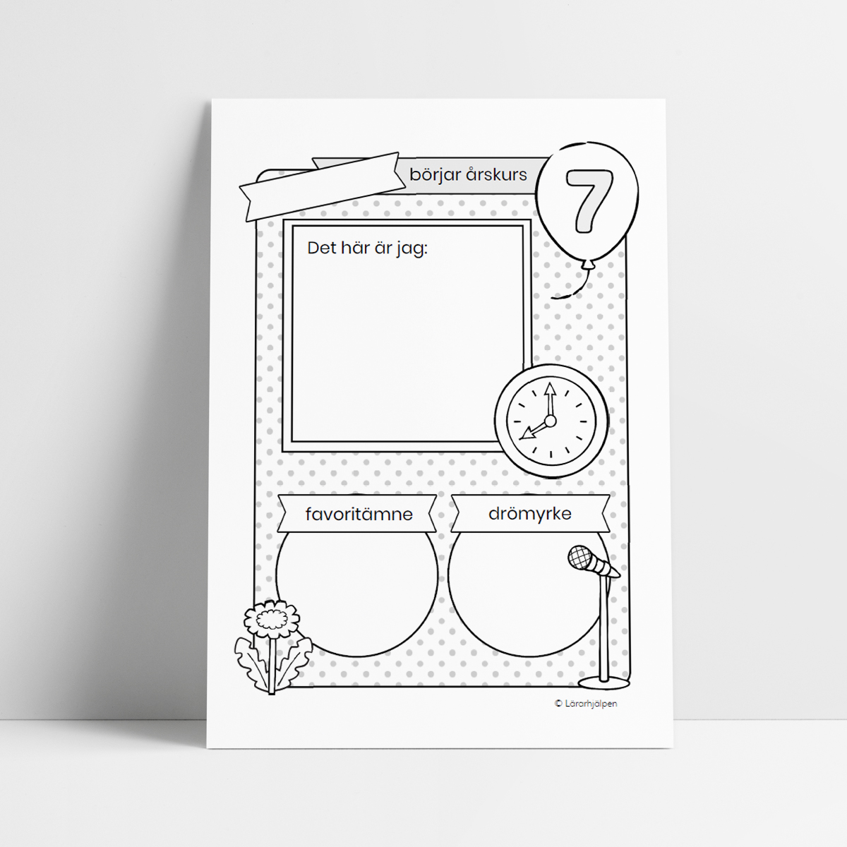 Dokumentet ingår i en serie med ett arbetsblad för varje årskurs i grundskolan. Det passar perfekt att använda vid starten av ett nytt läsår! Alla dokument i serien har liknande innehåll som syftar till att lära känna varje elev men utformningen av dokumenten ser olika ut för att undvika att eleverna gör samma arbetsblad flera år i rad. På banderollen finns plats för barnets namn.