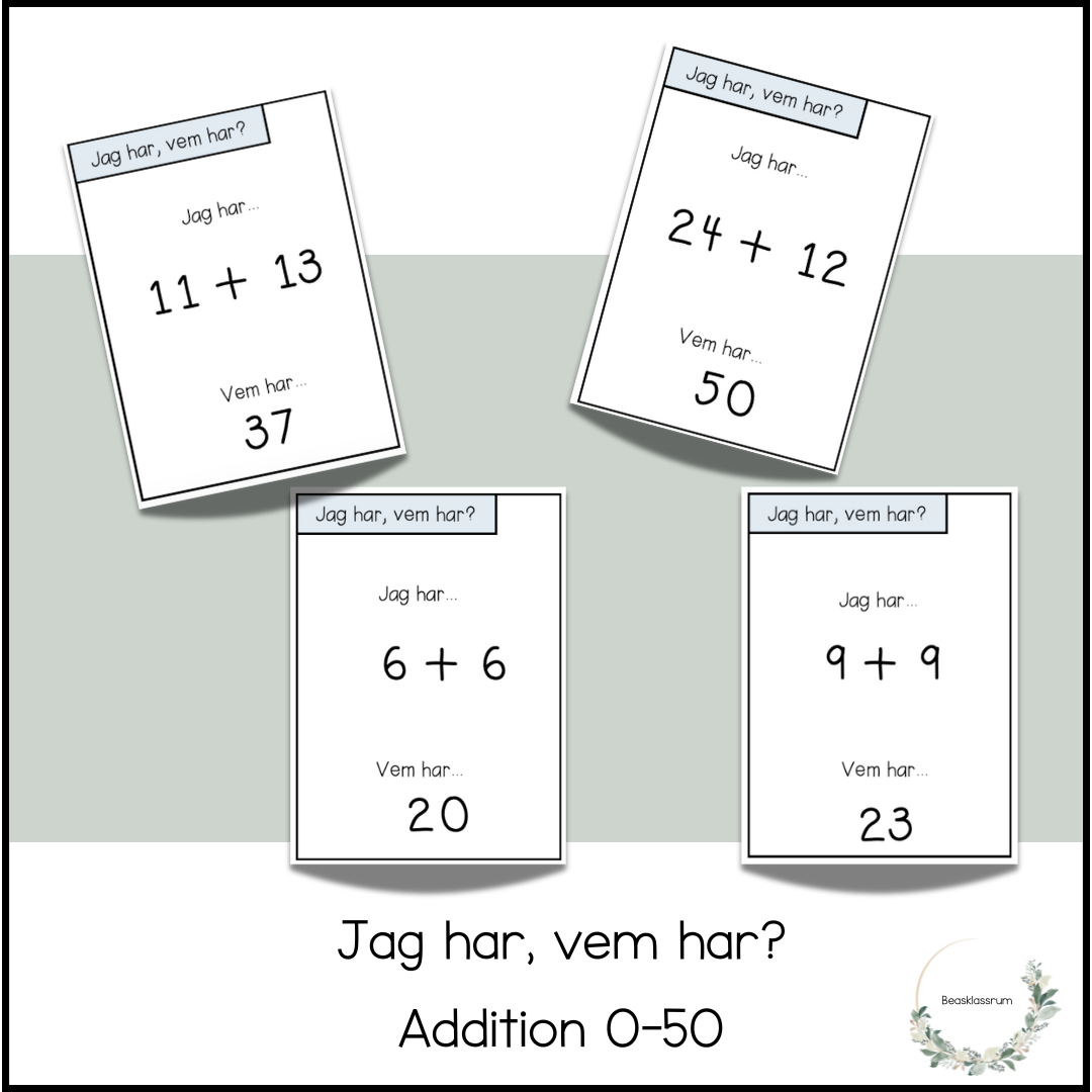 Jag har, vem har? Låt eleverna få träna addition i talområdet 0-50 på ett roligt sätt. Använd som brain break eller som del av lektion. Innehåller 30 kort.