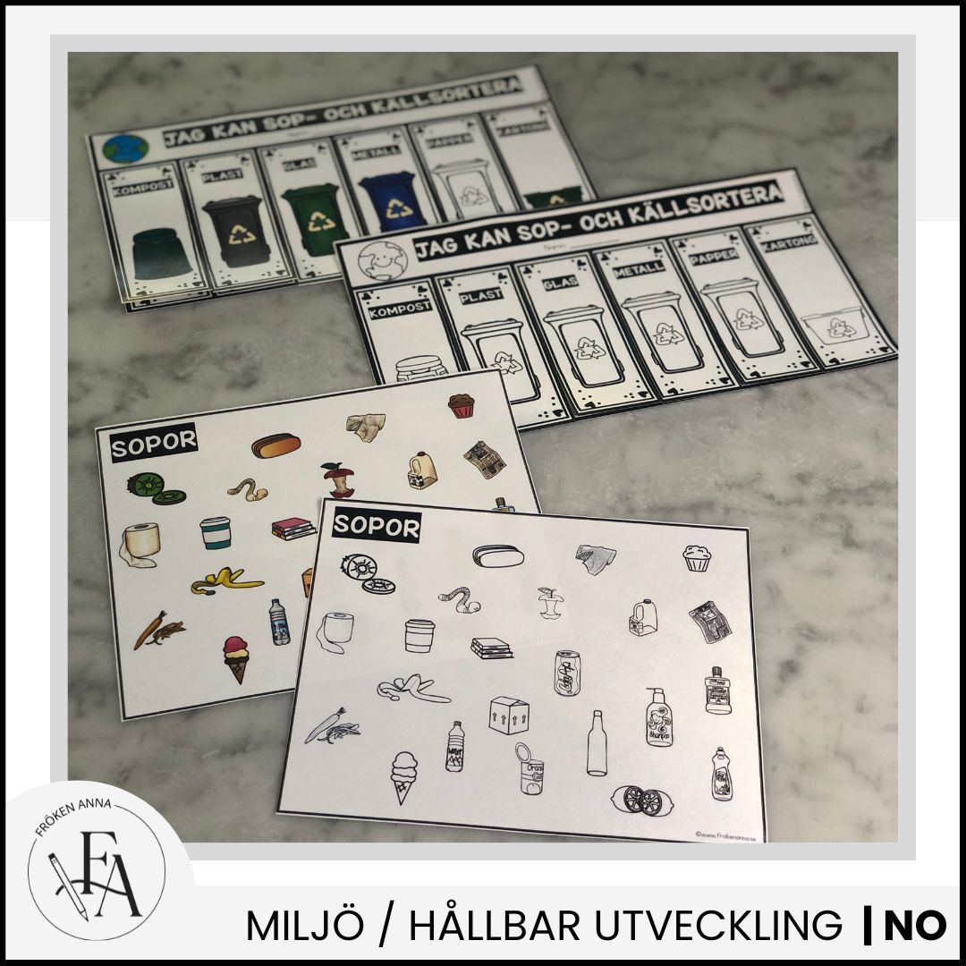 I detta visuella material får eleverna träna på att sop- och källsortera förpackningar och matvaruprodukter i rätt kärl: kompost, plast, glas, metall, papper eller kartong.