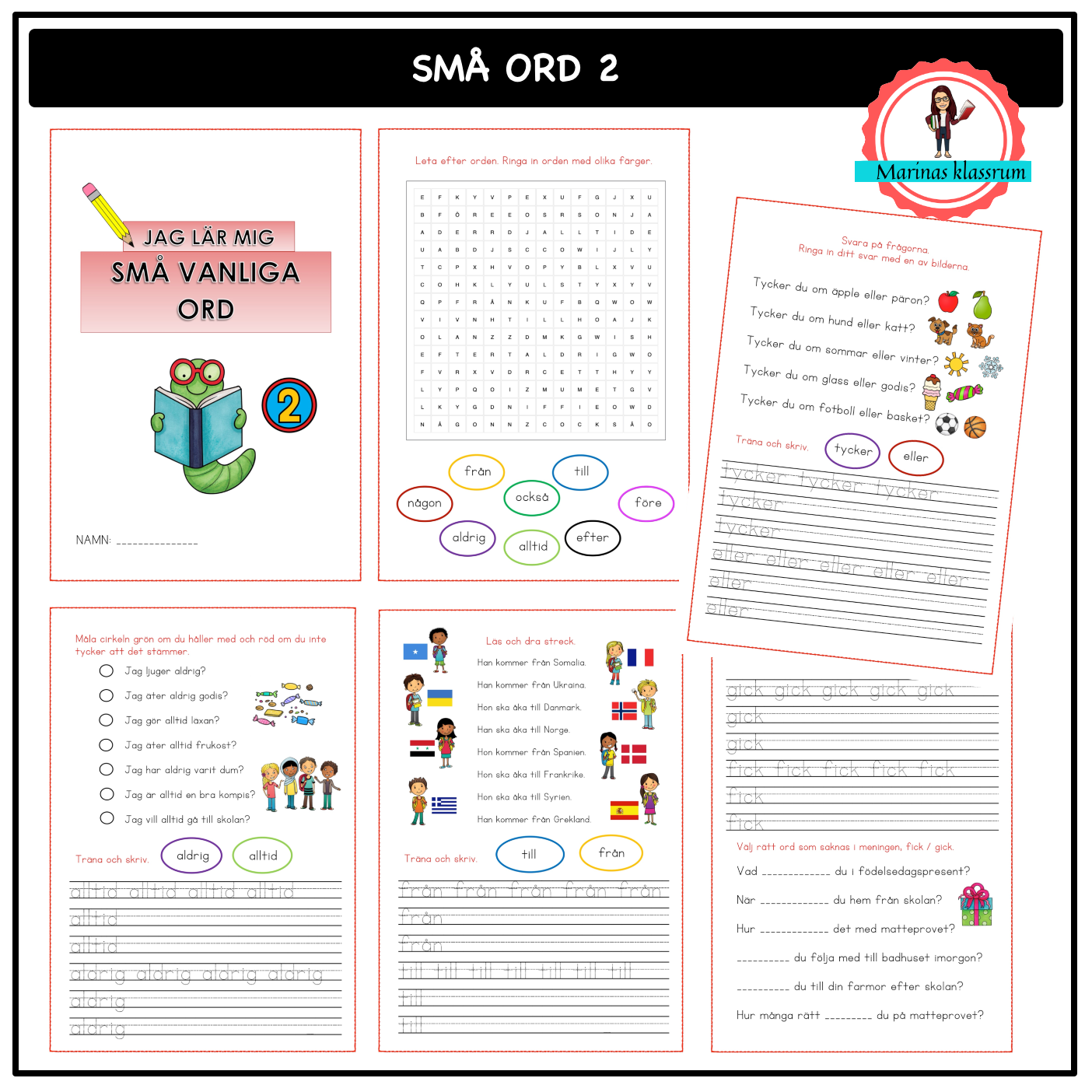 Ett arbetshäfte på 13 sidor som tränar vanliga högfrekventa ord som eleverna behöver automatisera för att underlätta vid läsinlärningen. Orden som tränas i detta häfte är följande 16 0rd: aldrig, alltid, till, från, före, efter, någon, också, eller, tycker, säger, finns, skulle, blir, gick, fick.