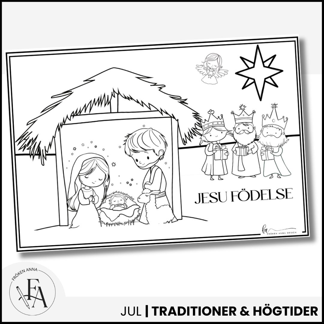 En fin målarbild som illustrerar Jesu födelse, perfekt för julens tema i klassrummet, på fritids eller hemma. Skapa julstämning och låt barnen färglägga denna stämningsfulla bild med Maria, Josef, Jesusbarnet och de tre vise männen. Passar utmärkt som en del av pyssel eller undervisning kring julens berättelser.
