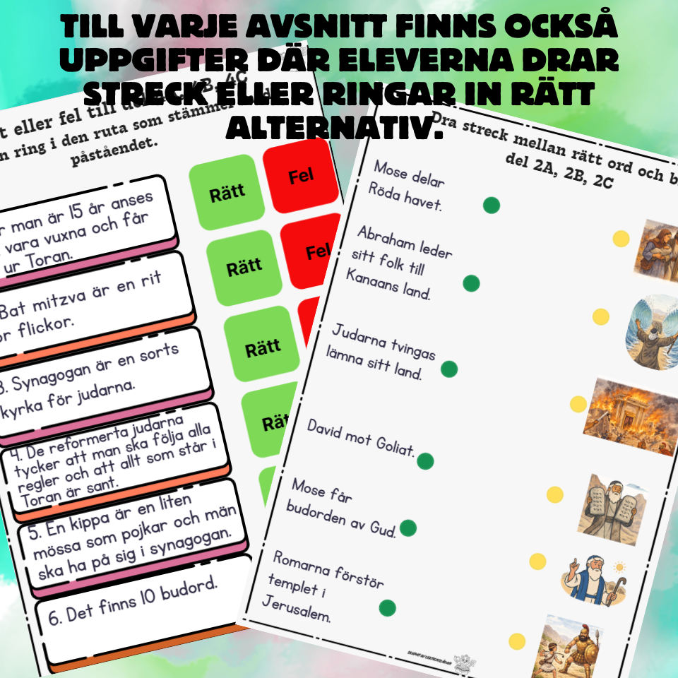 Arbetshäfte med korta och enkla texter och lätta uppgifter till texterna om judendomen. Texterna och uppgifterna är anpassade för elever som behöver extra stöd och hjälp i skolan. Texterna är utformade som elevers frågor och lärares svar till frågorna. På varje sida med text finns en kort sammanfattning av innehållet. Det finns gott om bildstöd knutna till ord och texter för att underlätta förståelsen. Till varje avsnitt finns enkla frågor och en uppgift där eleverna ska dra streck mellan ord och bild, sant eller falskt frågor eller uppgift med ordluckor. Materialet avslutas med en ordgömma och ett quiz för att kontrollera elevernas kunskaper. Dessutom finns det en ordlista (med en del bilder) till alla svåra begrepp i texterna. Materialet innehåller också ett tydligt facit till alla uppgifter. Ett mycket uppskattat material för de elever som har svårt att klara av skolans läromedel. OBS: Detta material finns också att köpa i ett samlingspaket med arbetshäften om judendom, kristendom och islam.