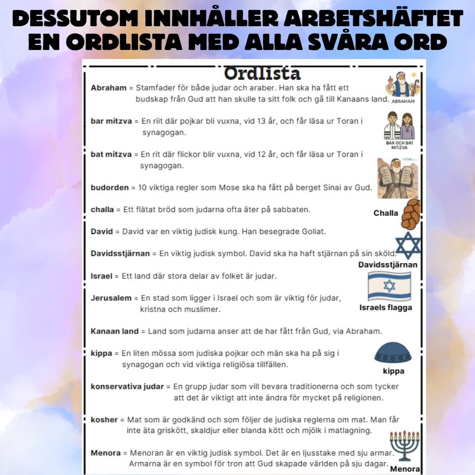 Arbetshäfte med korta och enkla texter och lätta uppgifter till texterna om judendomen. Texterna och uppgifterna är anpassade för elever som behöver extra stöd och hjälp i skolan. Texterna är utformade som elevers frågor och lärares svar till frågorna. På varje sida med text finns en kort sammanfattning av innehållet. Det finns gott om bildstöd knutna till ord och texter för att underlätta förståelsen. Till varje avsnitt finns enkla frågor och en uppgift där eleverna ska dra streck mellan ord och bild, sant eller falskt frågor eller uppgift med ordluckor. Materialet avslutas med en ordgömma och ett quiz för att kontrollera elevernas kunskaper. Dessutom finns det en ordlista (med en del bilder) till alla svåra begrepp i texterna. Materialet innehåller också ett tydligt facit till alla uppgifter. Ett mycket uppskattat material för de elever som har svårt att klara av skolans läromedel.