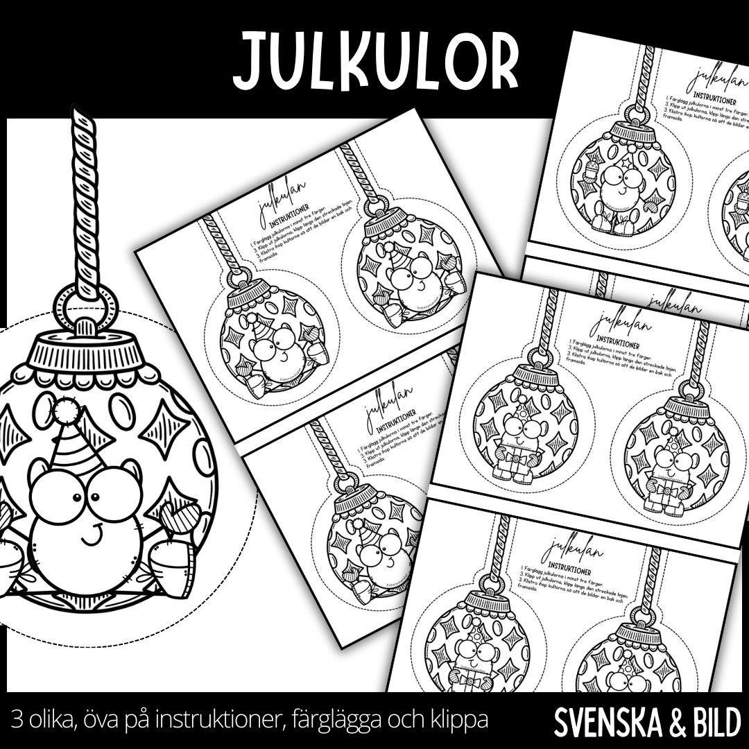 Pynta klassrummet med dessa julkulor. Låt eleverna följa instruktionerna, färglägga julkulorna och partynissarna, en bak och en framsida för att sedan klippa ut dem och limma ihop dem. Pynta klassrummet med elevernas julkulor.