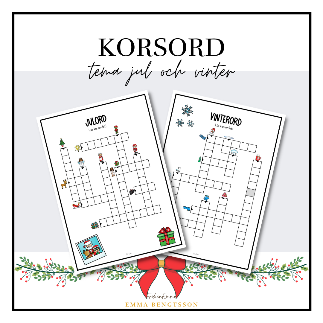 Två korsord, ett med jultema och ett med vintertema. Uppgiften är att fylla korsorden med orden som bilderna visar.