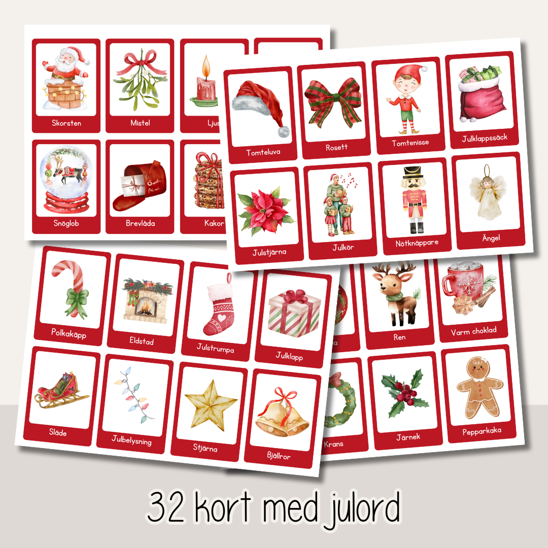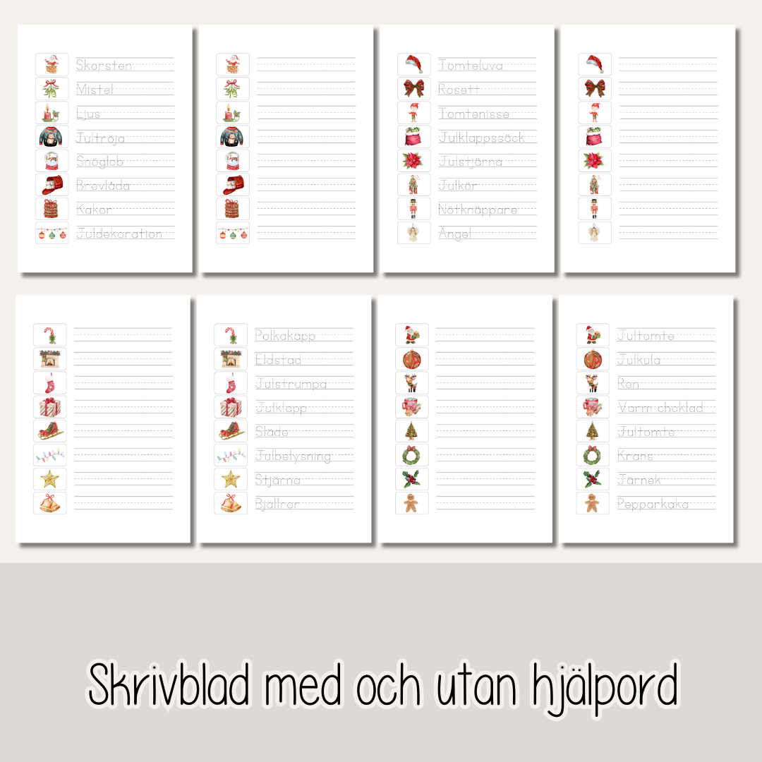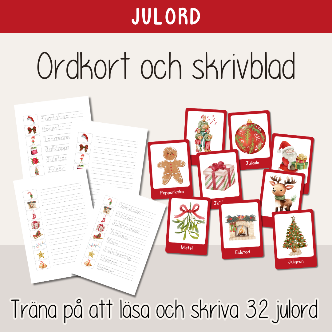 Ett paket med 32 st ordkort och tillhörande skrivblad med julord. Klipp ut korten och laminera för att använda om och om igen. Skrivbladen som hör till kommer i två olika varianter, med och utan hjälpord. Träna på att läsa och skriva julord.