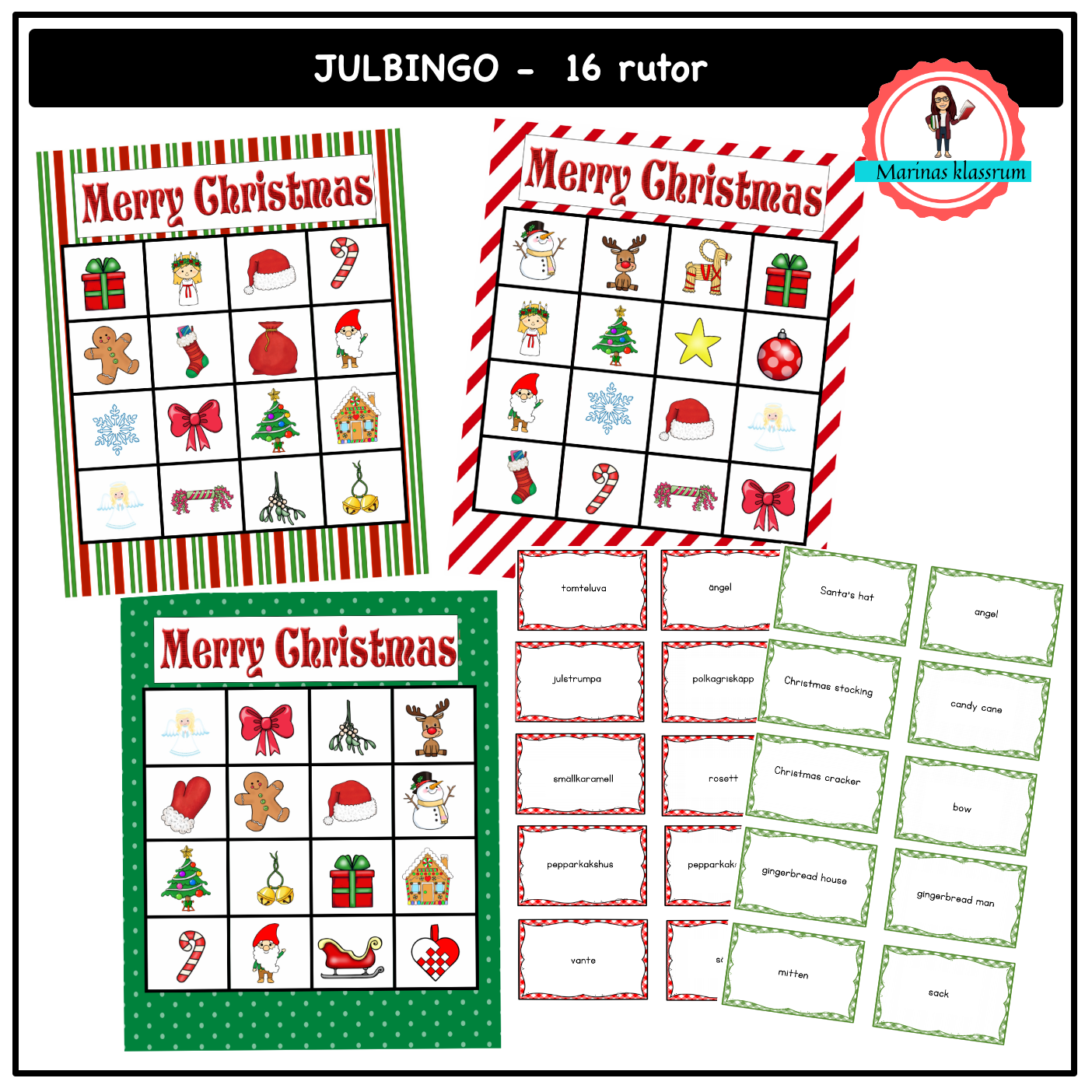 Träna på jul-ord med ett roligt bingospel för hela klassen. Materialet innehåller 24 olika bingobrickor och utrops-kort på både engelska och svenska, så att du kan välja om du vill spela bingo på svenska eller engelska. Detta bingo innehåller 16 rutor.