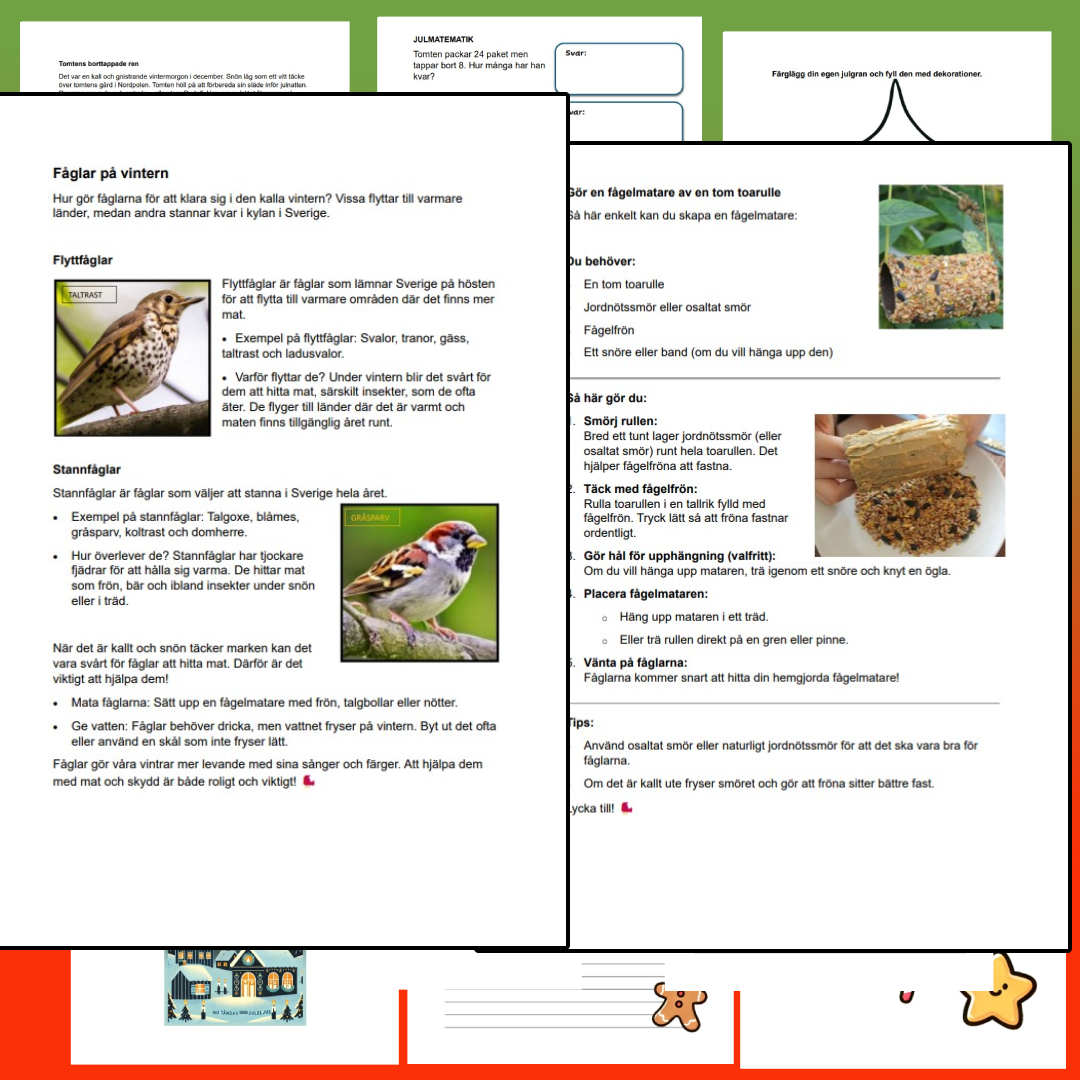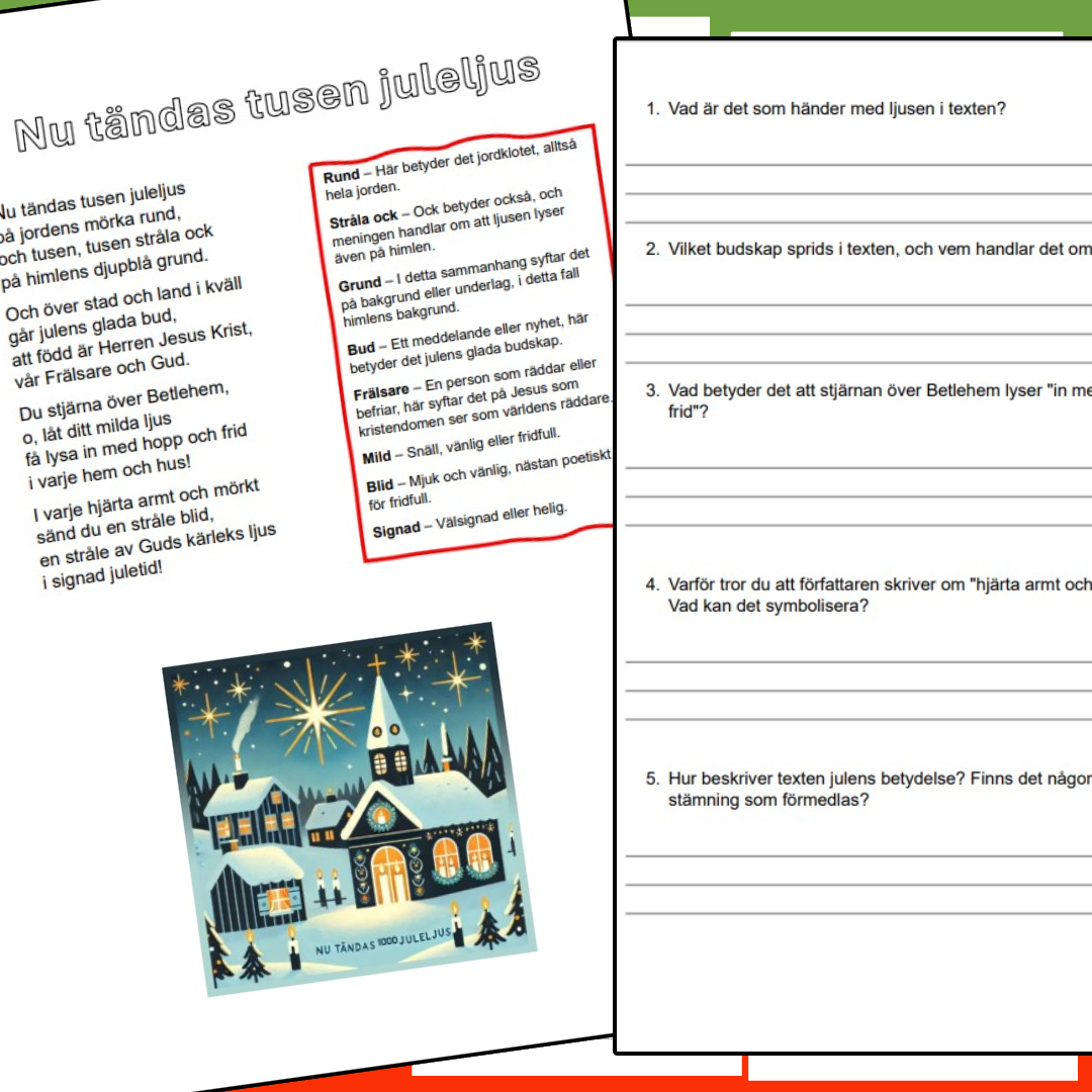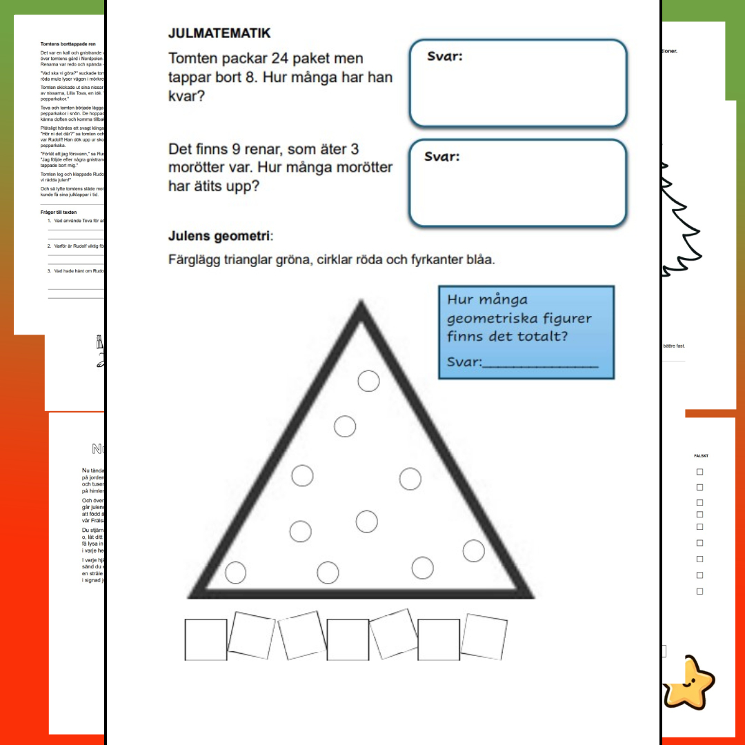 - Läsförståelse: Klassiska julteman, som Nu tändas tusen juleljus och en mysig berättelse om ”Tomtens borttappade ren,” med frågor som tränar elevernas läsförståelse.