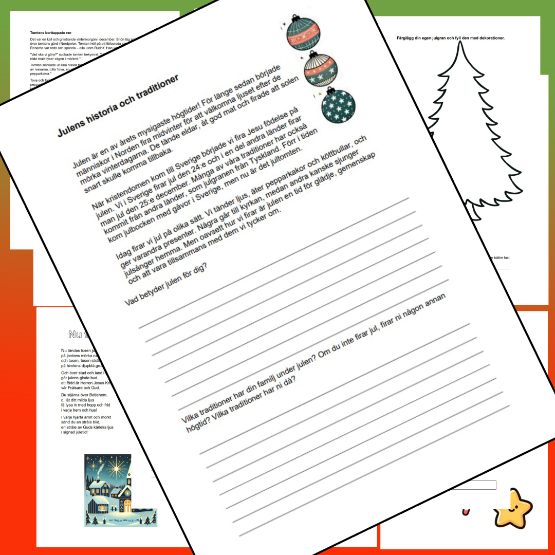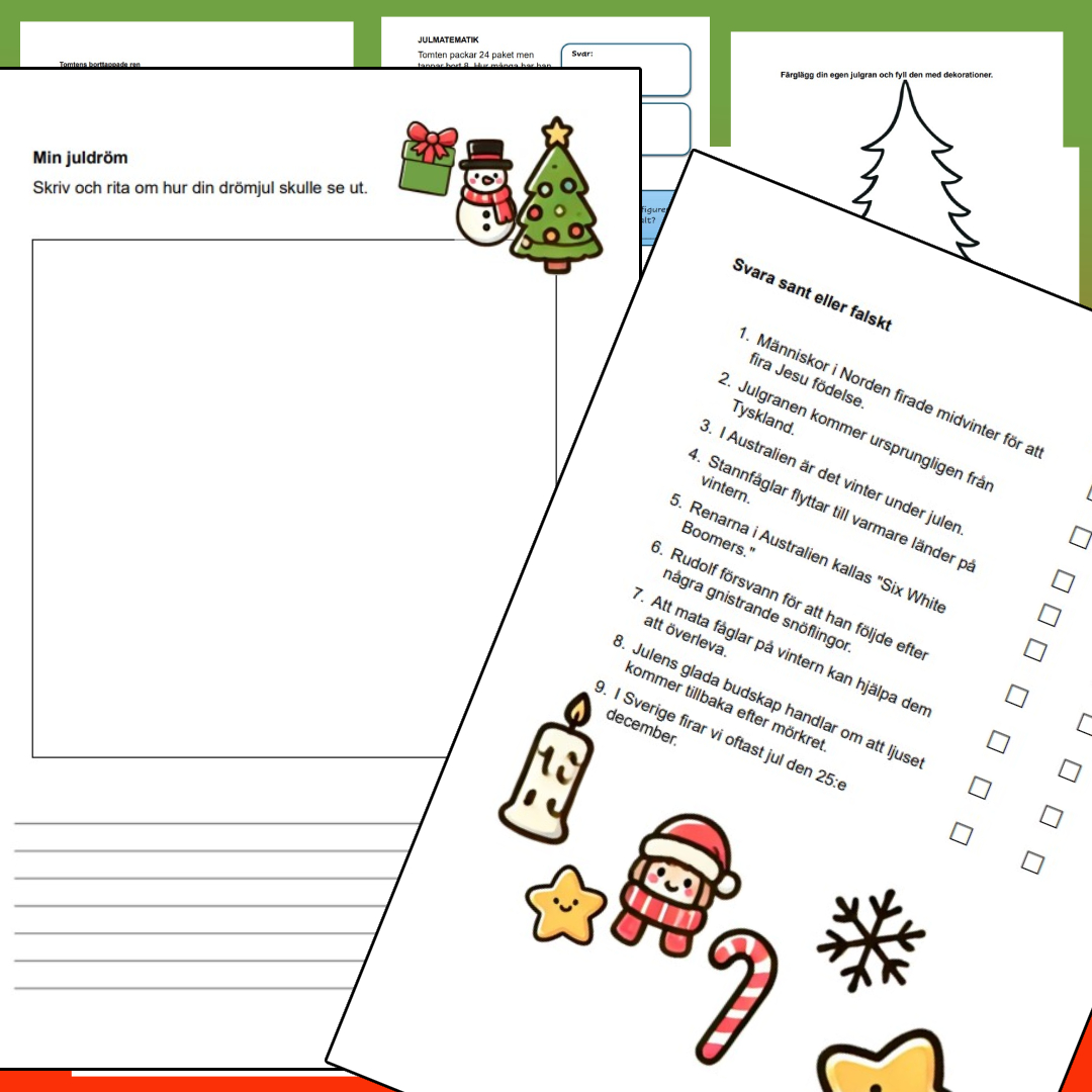 - Skrivövningar: Eleverna får reflektera över sina egna jultraditioner och skapa sin drömjul.