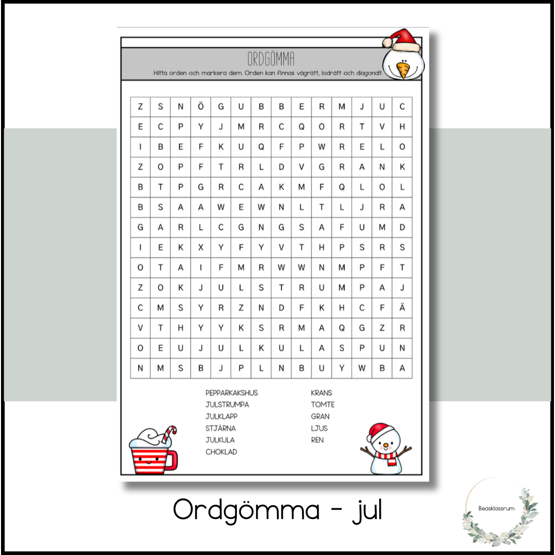 Ordgömma med ord som hör till vintern och julen. Materialet finns med i mitt material Julhäfte.