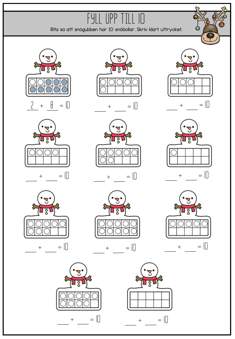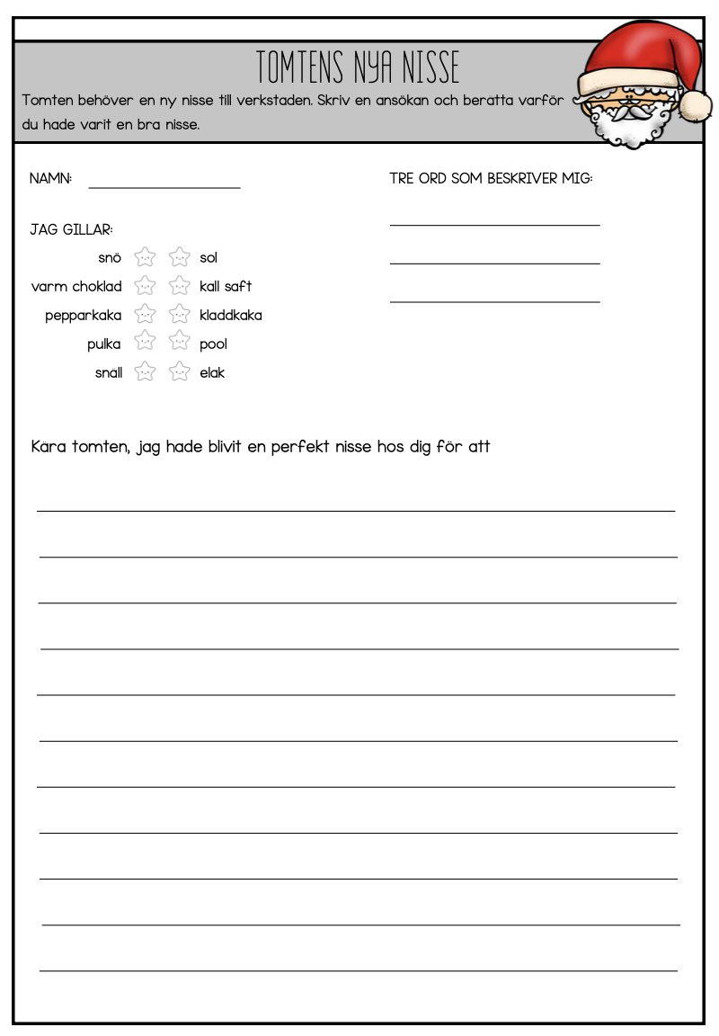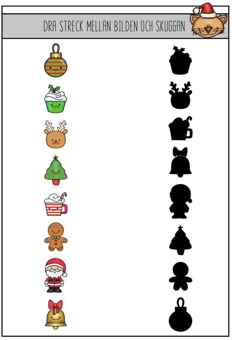 Julhäfte på 19 sidor -välskrivning -2 labyrinter -rita prick till prick -räkna julgodis (upp till 10) -dra streck mellan bild och skugga -korsord -sant eller falskt (läsförståelse) -ordgömma -färglägg julelefanterna -rita likadant -hur många (räkna antal) -fyll upp till 10 -sagan om Ella (läsförståelse) -skriv en julberättelse till sekvensbilder -rita antal -bygg ord -vilken form har snögubben -tomtens nya nisse