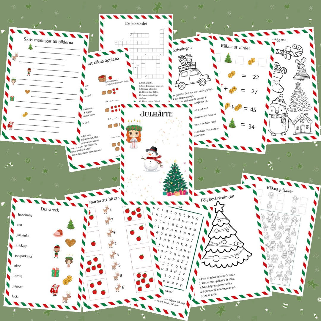 Ett julhäfte (7 sidor) i två olika nivåer. I häftet finns uppgifter i svenska, matte och bild.