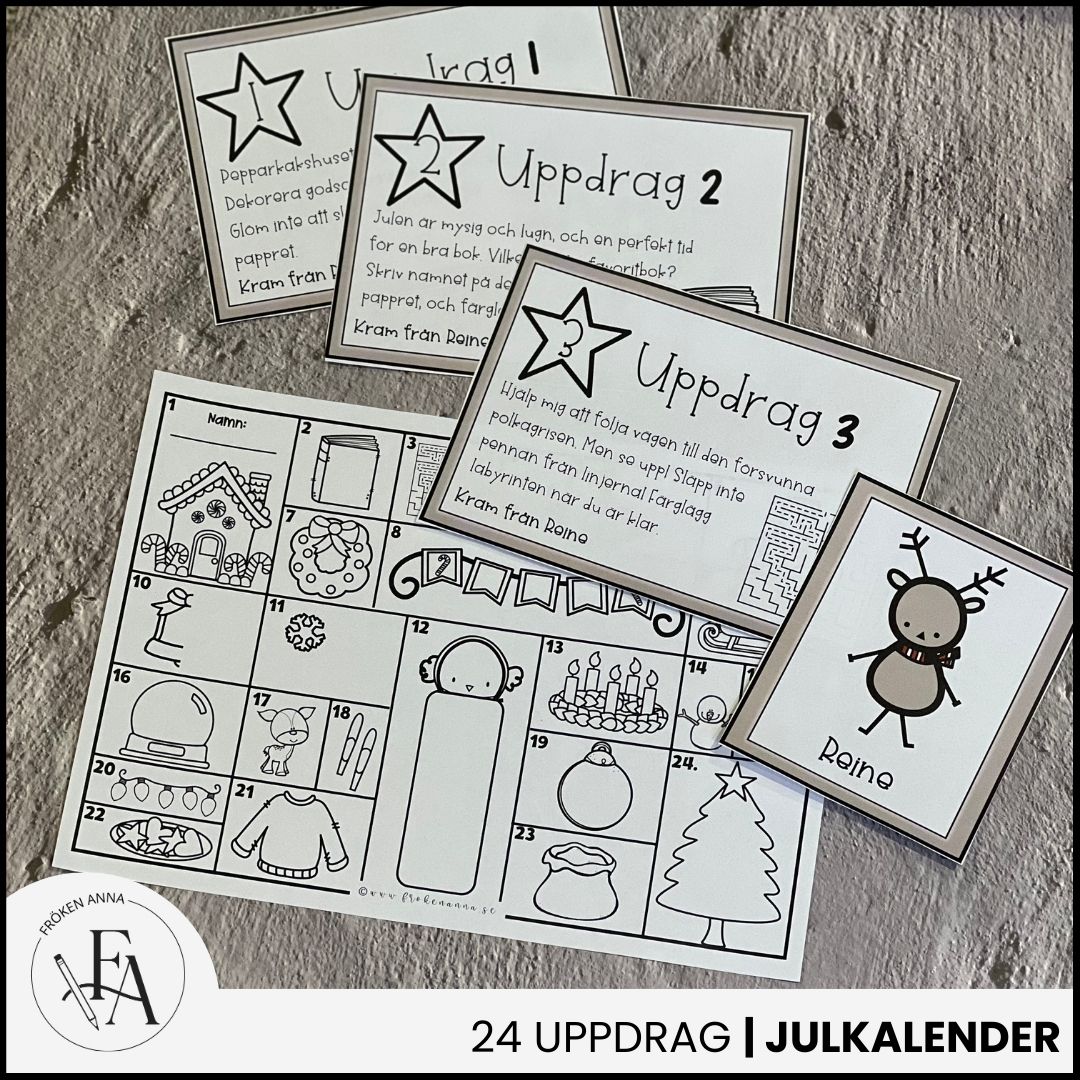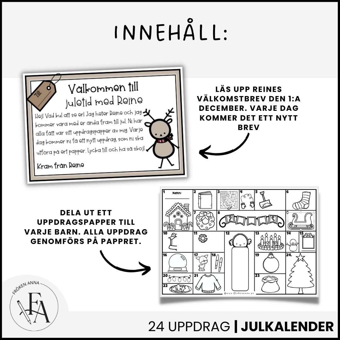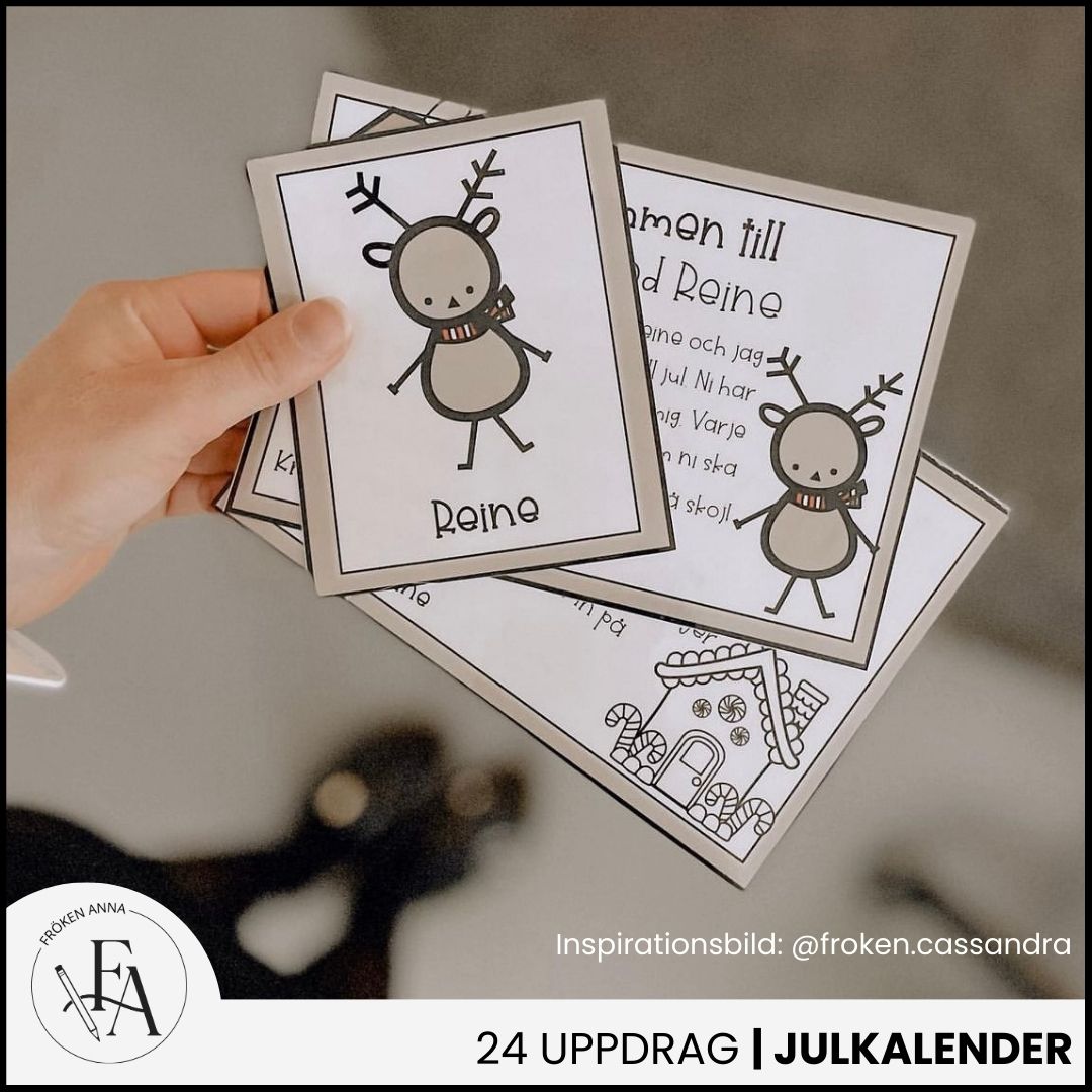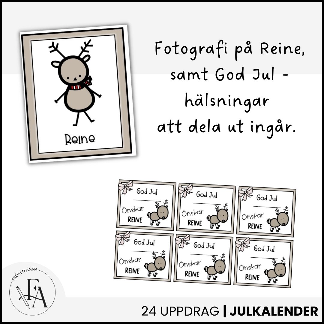 Räkna ner till julen med renen Reine och hans enkla och kreativa juluppdrag. Dela ut ett uppdragspapper till varje barn eller elev (med fördel i A3) och låt barnen genomföra dagens uppdrag på sitt papper. Uppdragen kan visas på projektor eller skrivas ut i A4 eller A5 och levereras vid t.ex. en ”nissedörr” eller annan plats.