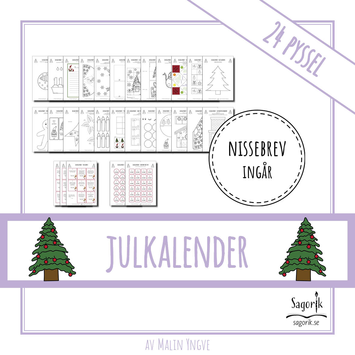 En julkalender/adventskalender där barnen får ett nytt kreativt pyssel varje dag i december ända fram till julafton. För er som har en liten tomtenisse på besök medföljer även nissebrev anpassade för varje pyssel. Perfekt för dig som vill fixa kreativa, roliga och pedagogiska julpyssel till barnen eller eleverna utan att behöva lägga tid och energi på förberedelser. Ta fram färgpennor, sax och lim och gör dig redo för 24 magiska pysselstunder med denna pysselkalender! DETTA INGÅR i Julkalender Kreativa pyssel med nissebrev: – 24 kreativa pyssel, med instruktioner – Ett nissebrev till varje pyssel, samt ett alternativ med endast ett brev första och sista dagen – Datumetiketter att sätta på pysselbladen, två olika designs Design och illustrationer av Malin Yngve.