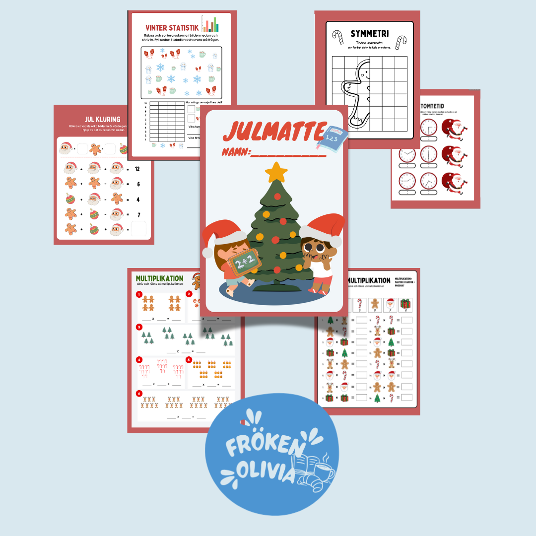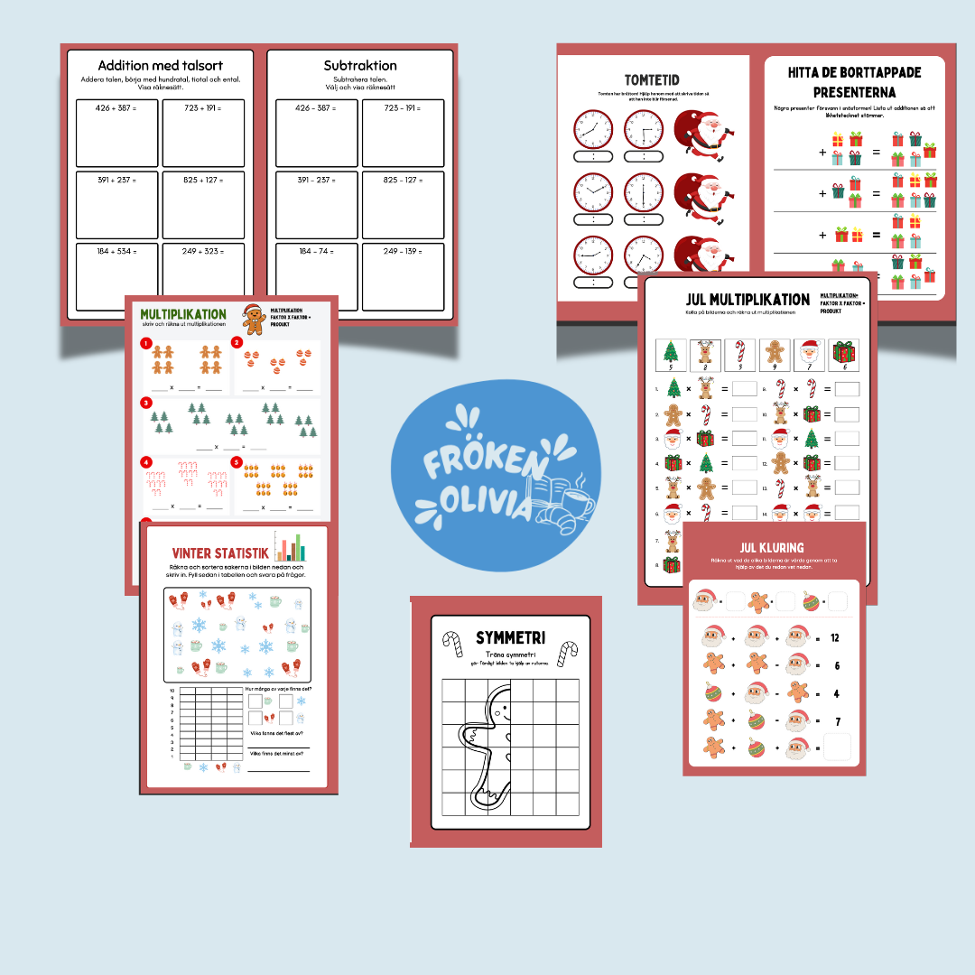 Ett roligt julmatte-häfte med multiplikation, addition och subtraktion med hundratal, symmetri, kluring, tid och statistik. Slänger även in ett jullovs läsbingo!
