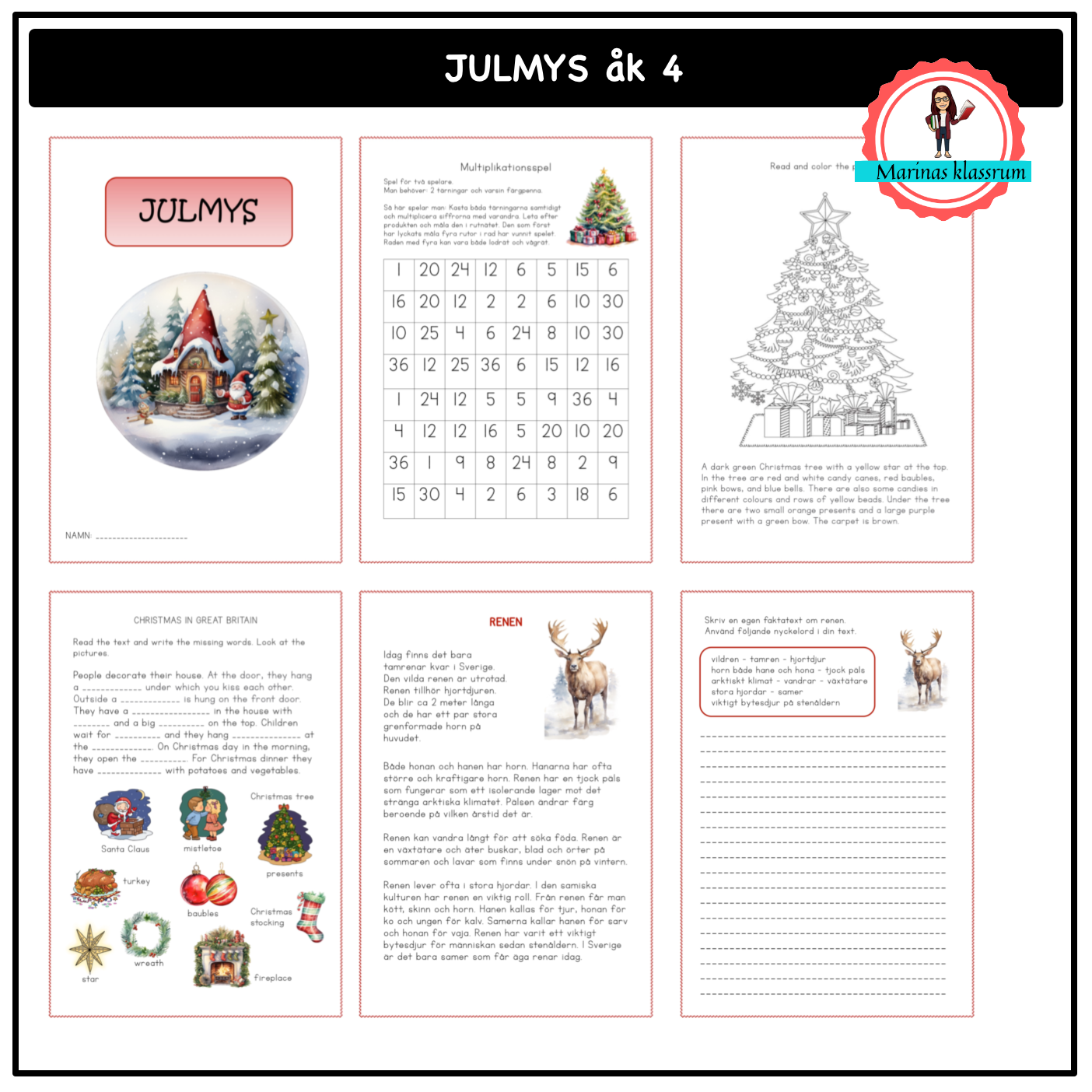 Ett arbetshäfte med olika övningar i matematik, engelska och svenska med jultema. Totalt 8 sidor plus en framsida. Passar bra i slutet på terminen innan jullovet.