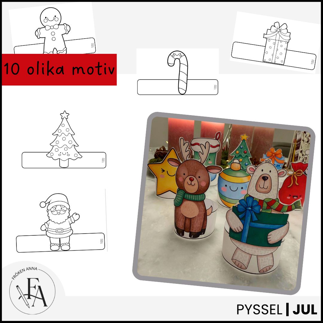 Julfigurer – ett roligt pysselmaterial med 10 olika motiv att färglägga, klippa ut och använda som dekoration. Perfekt till klassrummet, fritids eller hemmet under jul. Figurerna skapar en lekfull och stämningsfull miljö samtidigt som barnen får öva kreativitet och finmotorik.