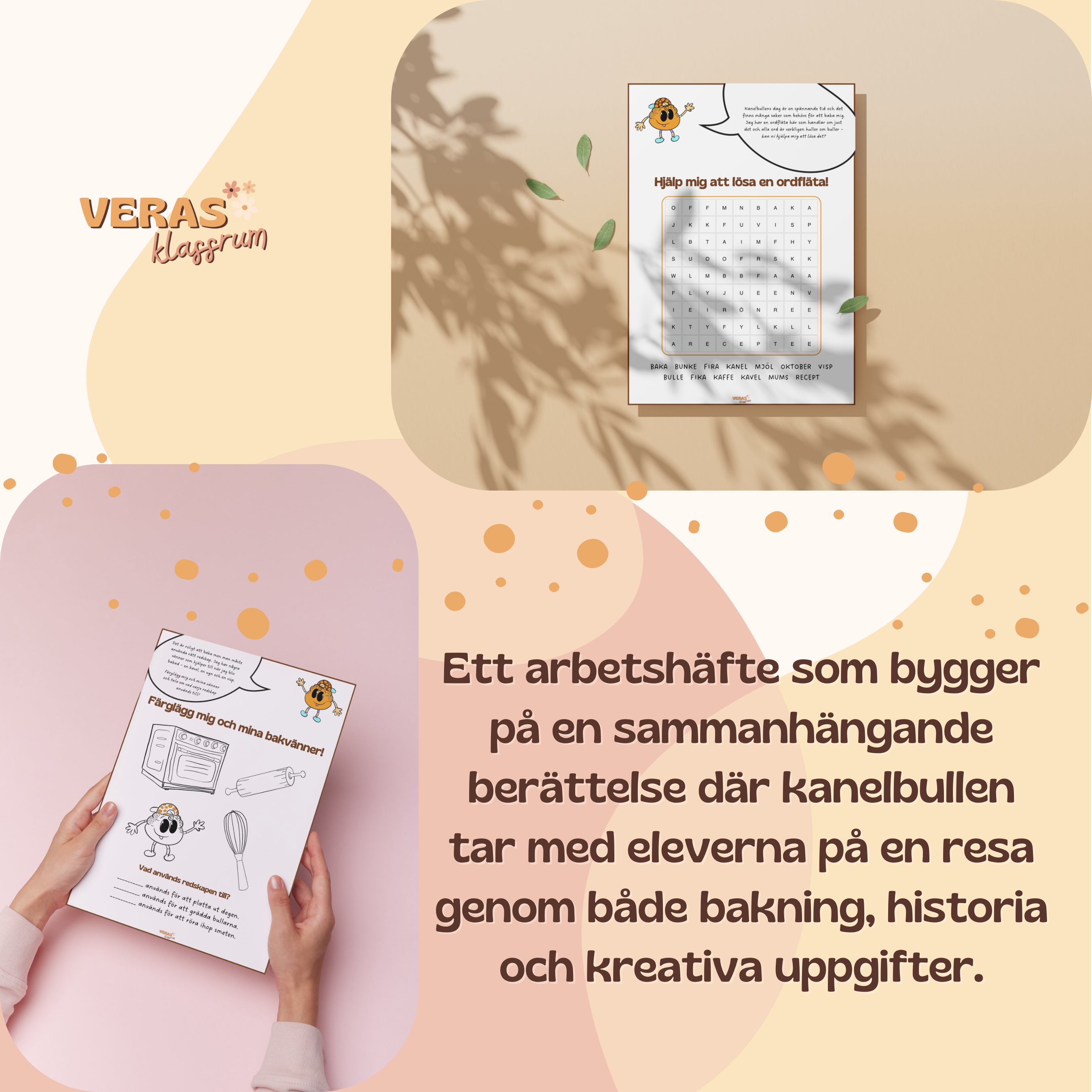 Detta arbetshäfte bygger på en sammanhängande berättelse där kanelbullen tar med eleverna på en resa genom både bakning, historia och kreativa uppgifter.