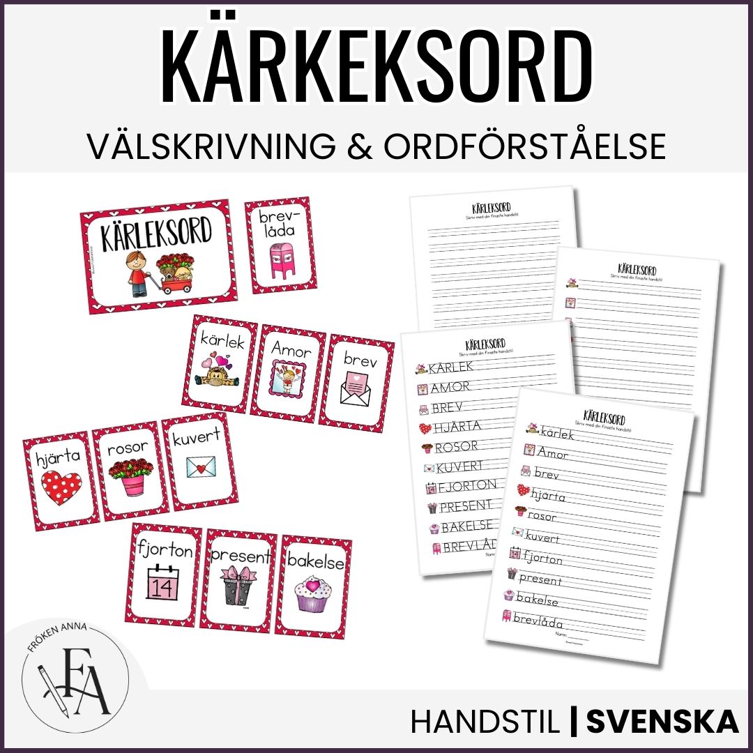 I detta set ingår 10 kärleksrelaterade ordkort med bild och ord (Dessa kan även användas som memory om ni skriver ut dubbletter) samt fyra arbetsblad: i versaler, gemener samt med och utan text.