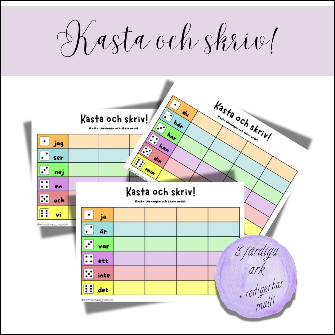 Låt eleverna träna på ord genom att spela spel. Eleven kastar en tärning och skriver det ord tärningen visar. Dela in dem i par eller grupp eller prova att spela i helklass, vem fyller en eller två rader först?