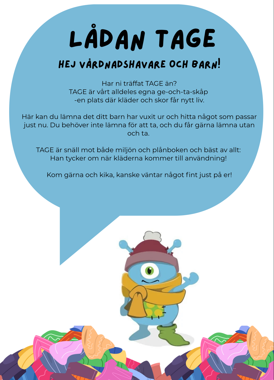 - Skåpet/ lådan TAGE är ett pedagogiskt material som inspirerar till hållbarhet, gemenskap och omtanke. Med hjälp av den charmiga figuren TAGE får barn och vårdnadshavare möjlighet att ge kläder nytt liv genom ett ”ge-och-ta-skåp” på förskolan.