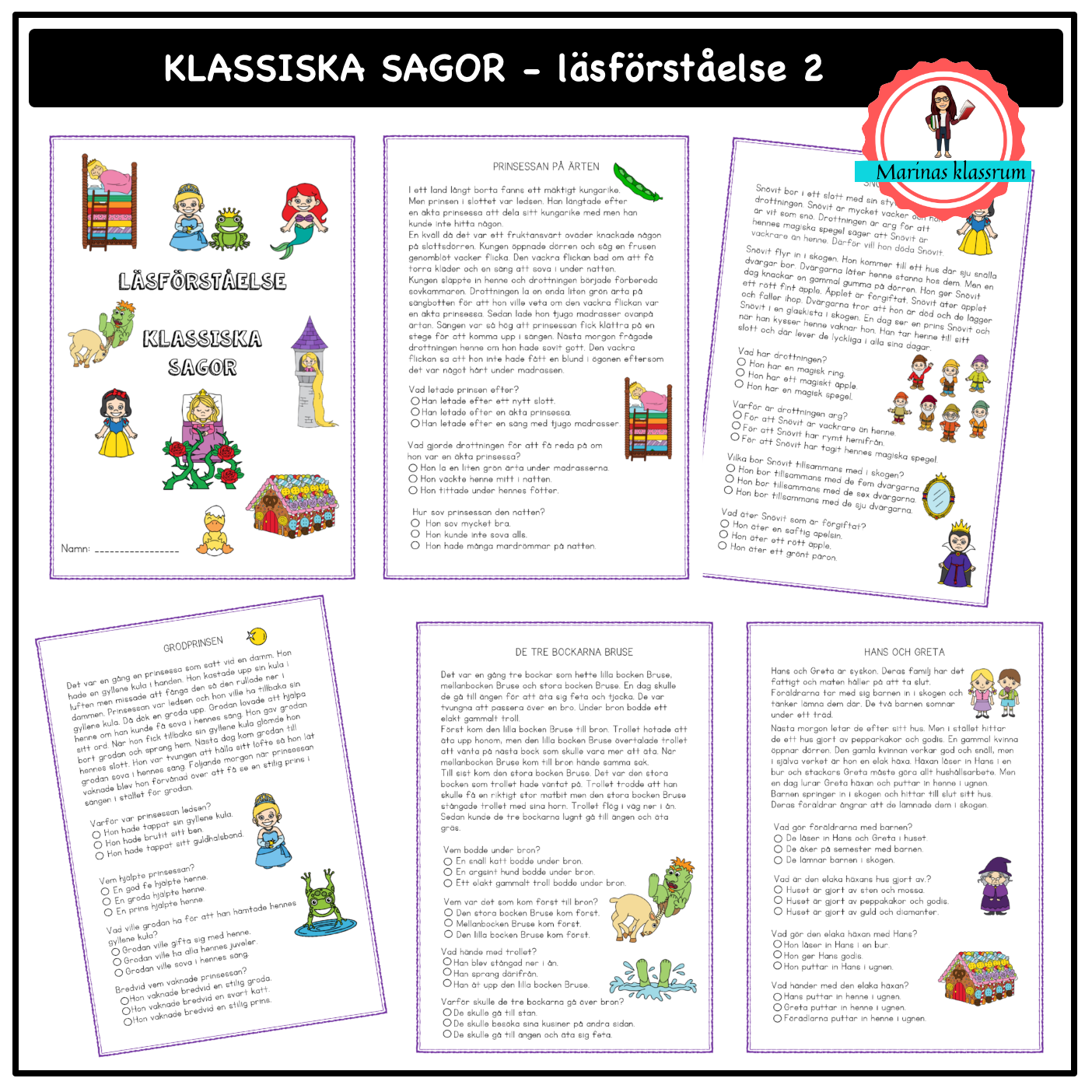 Ett läsförståelse häfte med kända klassiska sagor. Eleverna läser texten och svarar på fyra frågor genom att pricka för rätt svarsalternativ. En framsida och ett läsprotokoll ingår också.
