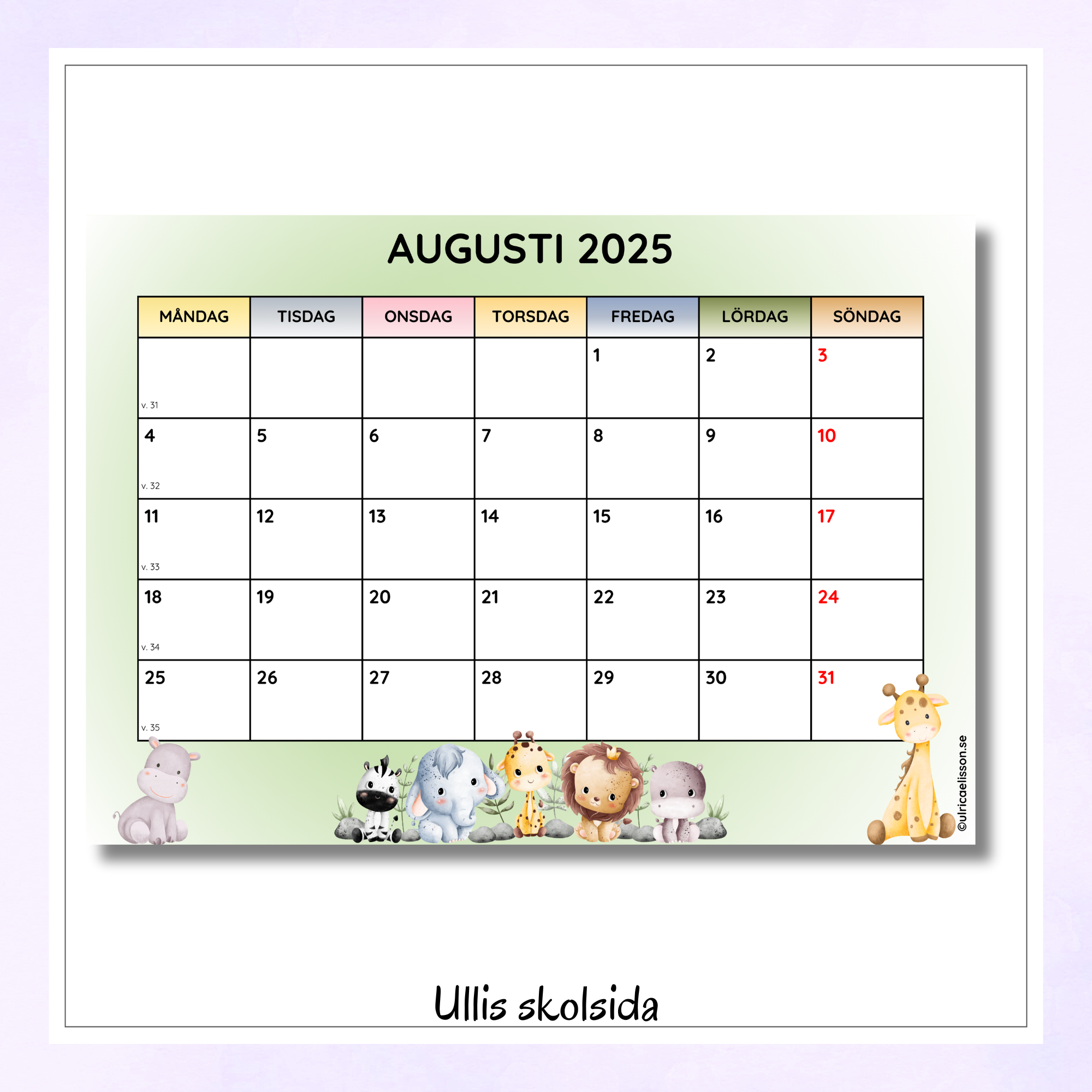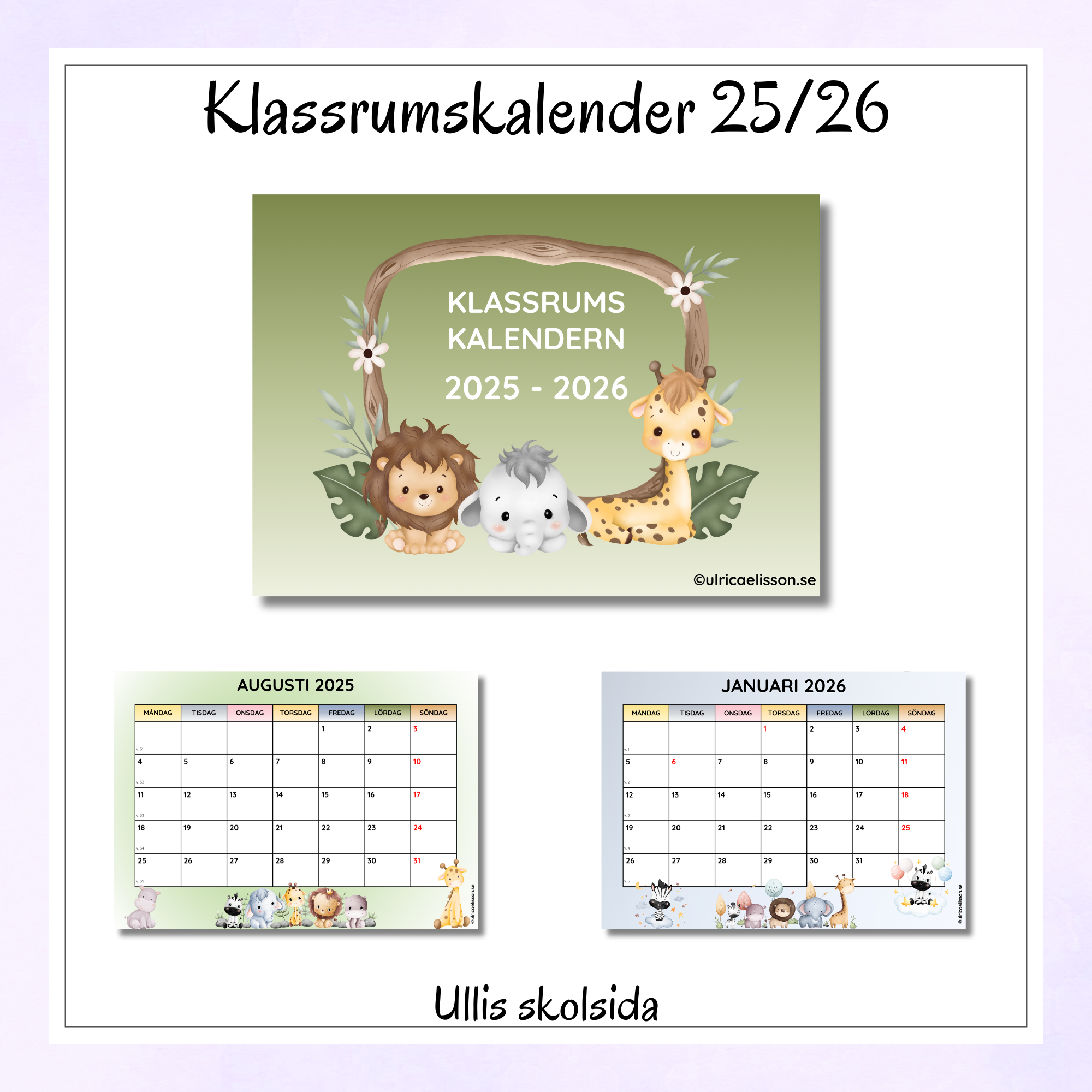 Kalender i A4, månadsvis för hela läsåret. Även redigerbar fil följer med. För att komma åt den krävs ett Google konto.