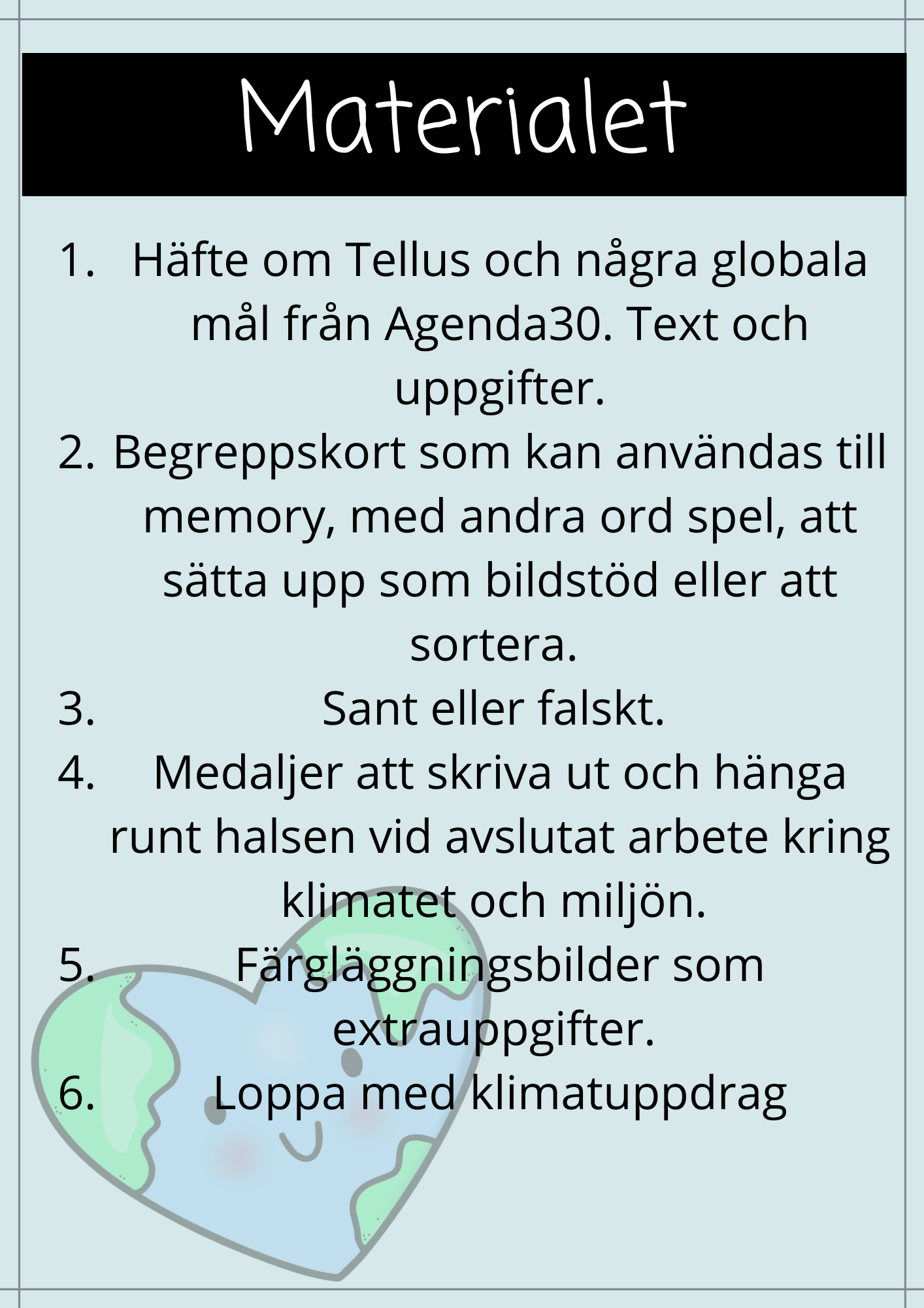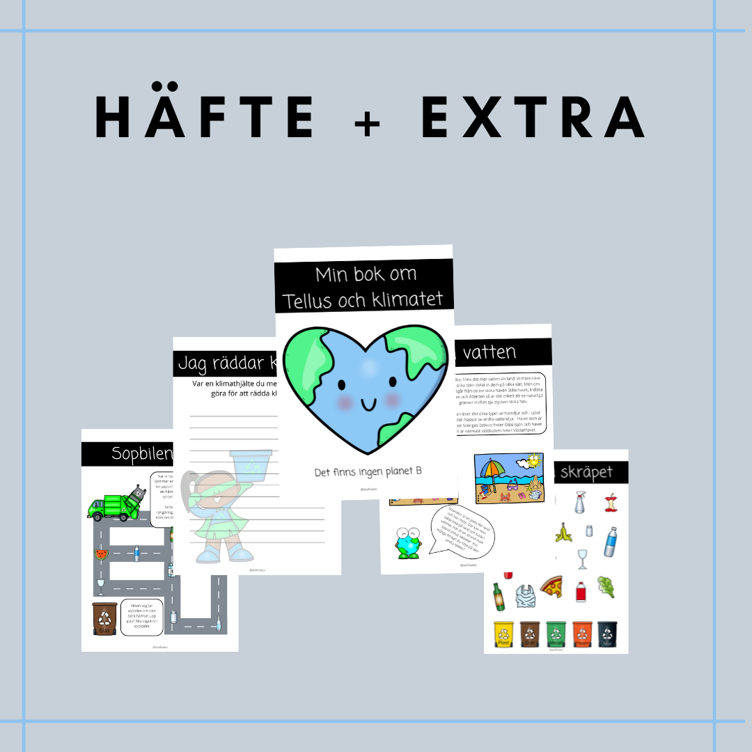 Ett materialpaket som innehållet följande: * Häfte med text och uppgifter * Sant och falskt om området * Begreppskort * Klimathjälteloppa * Klimathjältemedaljer * Extra läs och färglägguppgifter * Klimatbingo