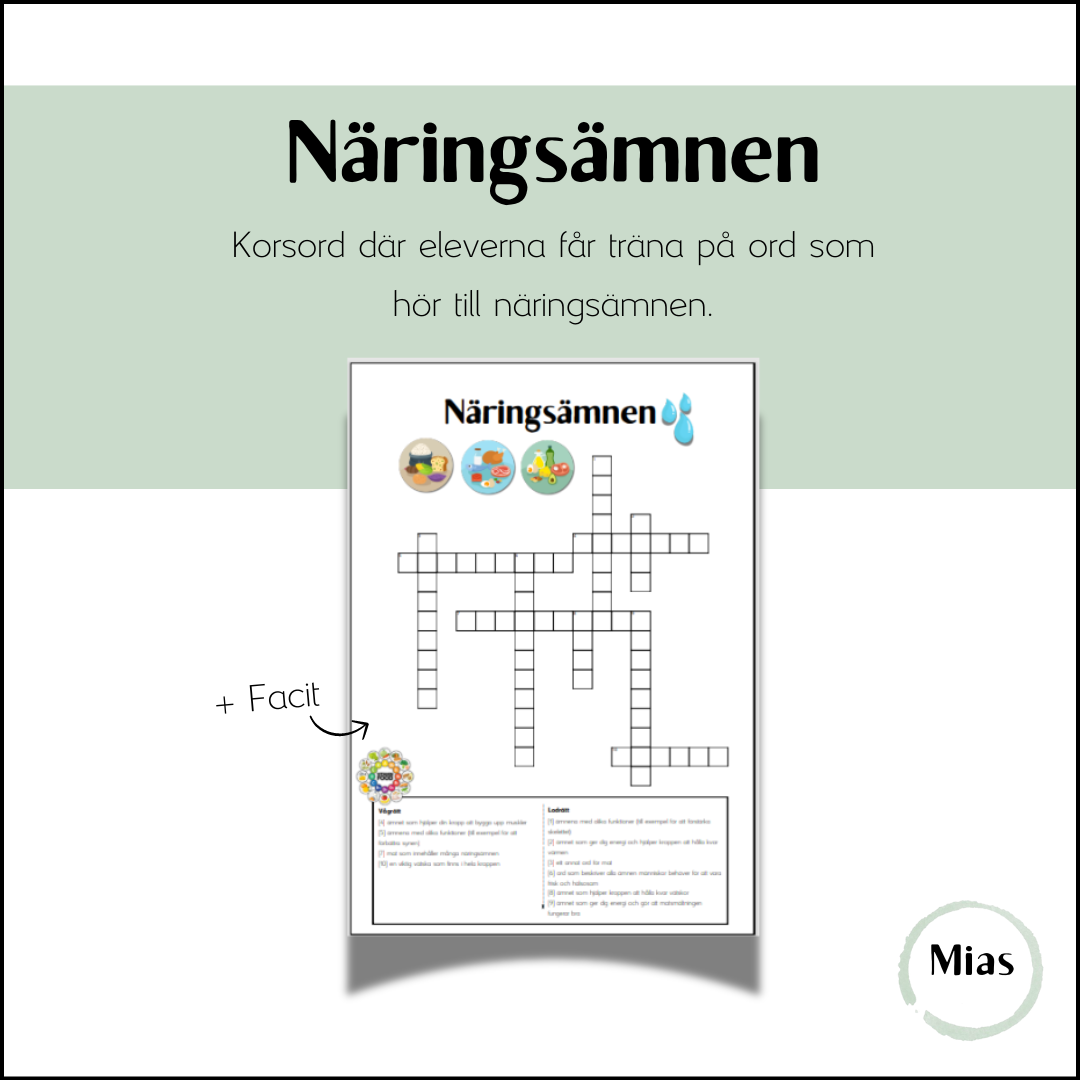 Korsord där eleverna tränar ord som här till näringsämnen + facit.