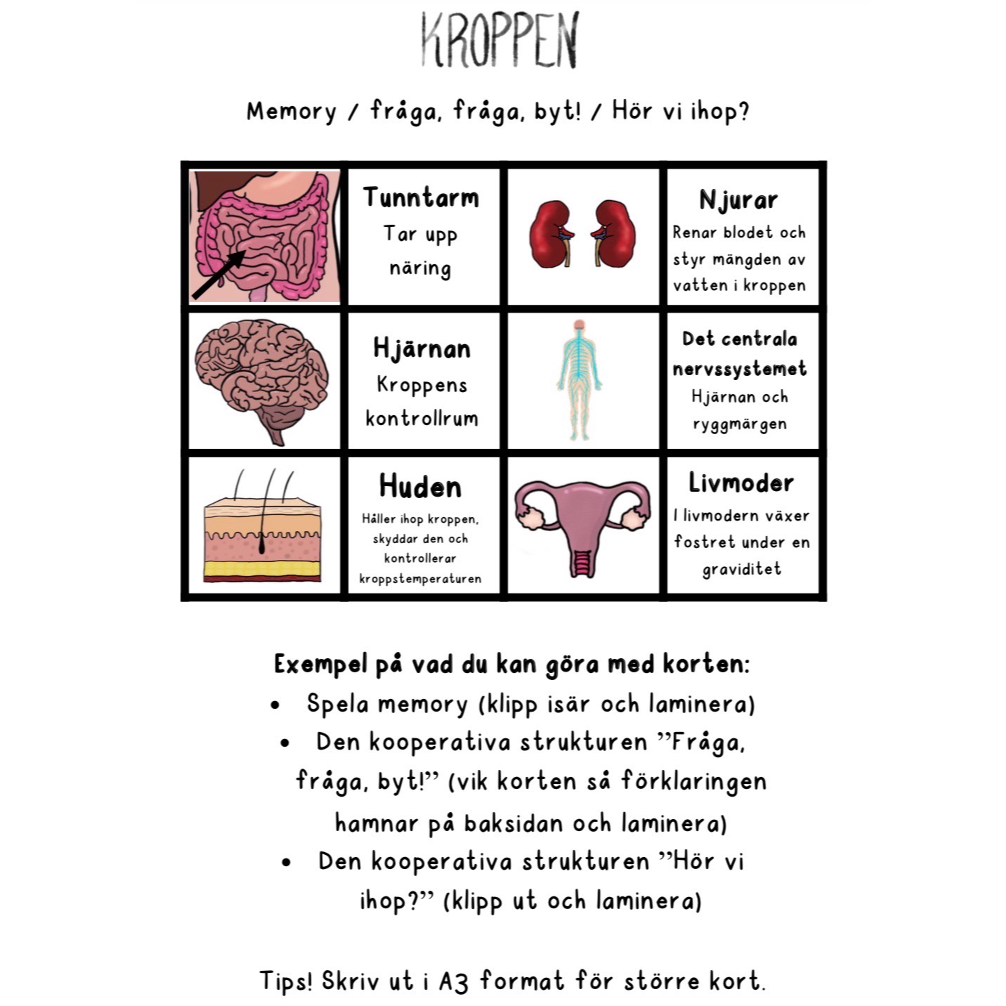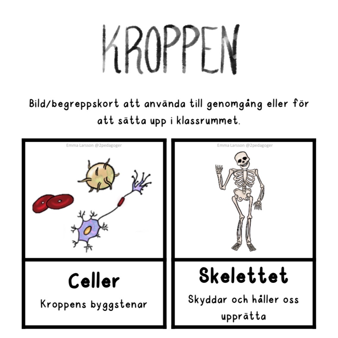 - Bild & begreppskort att använda vid genomgångar eller sätta upp i klassrummet i och med arbetets gång (celler, skelettet, muskler, hjärtat, blodomloppet, lungor, matsmältningssystemet, levern, magsäcken, tjocktarm, tunntarm, ändtarm, centrala nervssystemet, hjärnan, njurar, huden, livmoder, matstrupen).