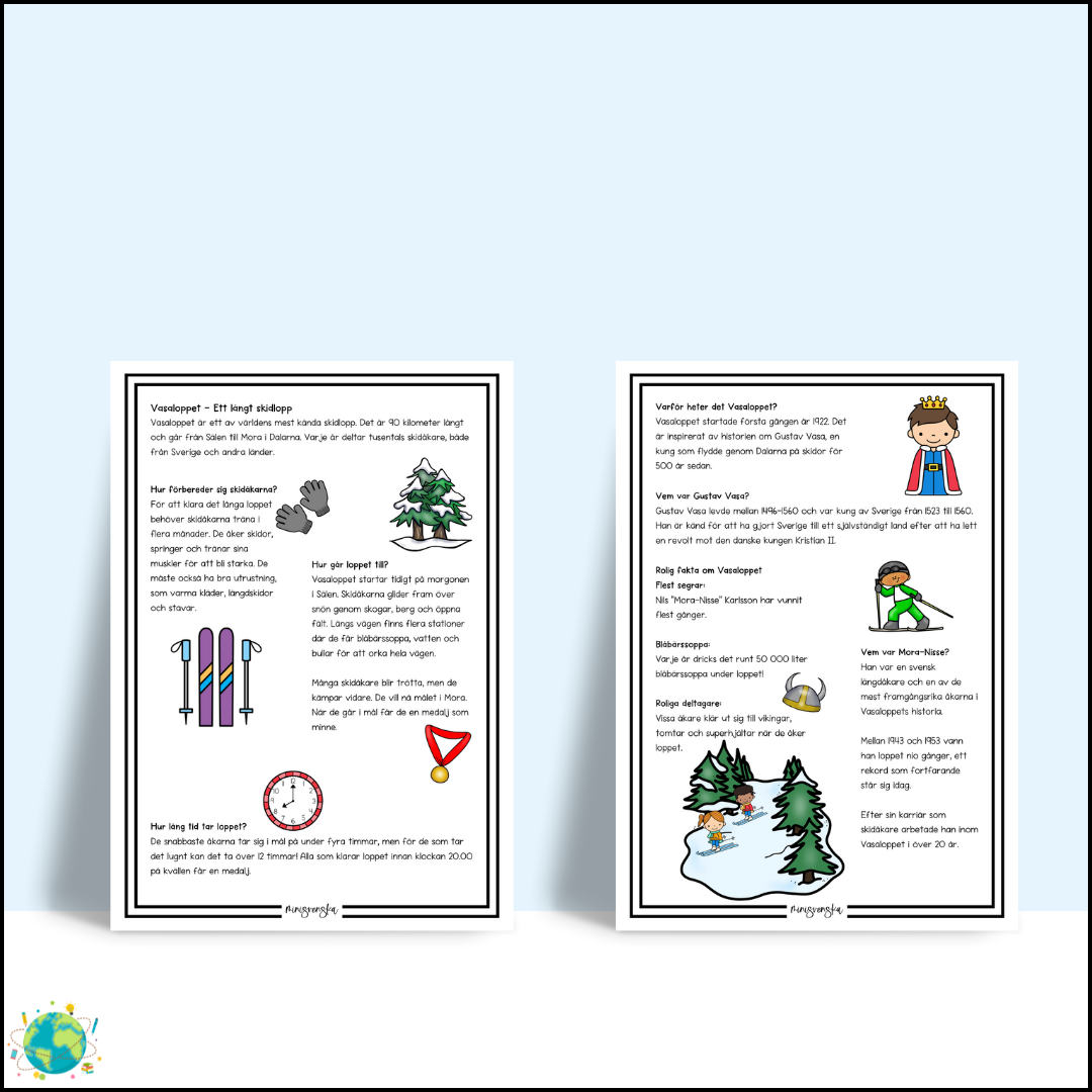 Upptäck historien bakom Vasaloppet! Läs en längre text om skidtävlingen, Mora-Nisse och Gustav Vasa. Materialet hjälper eleverna att förstå mer om loppet och dess betydelse i Sverige. Perfekt för att utveckla sin läsförståelse! -En längre text om Vasaloppet -Fakta om Mora-Nisse och Gustav Vasa -Läsförståelsefrågor och bildstöd Innehåll: Måla Dalarnas län Mellan vilka platser går Vasaloppet? Frågor till texten Ordklasser Vad gör de? Beskriv barnen Skriv om Vasaloppet Upptäck Dalarna PDF: A4