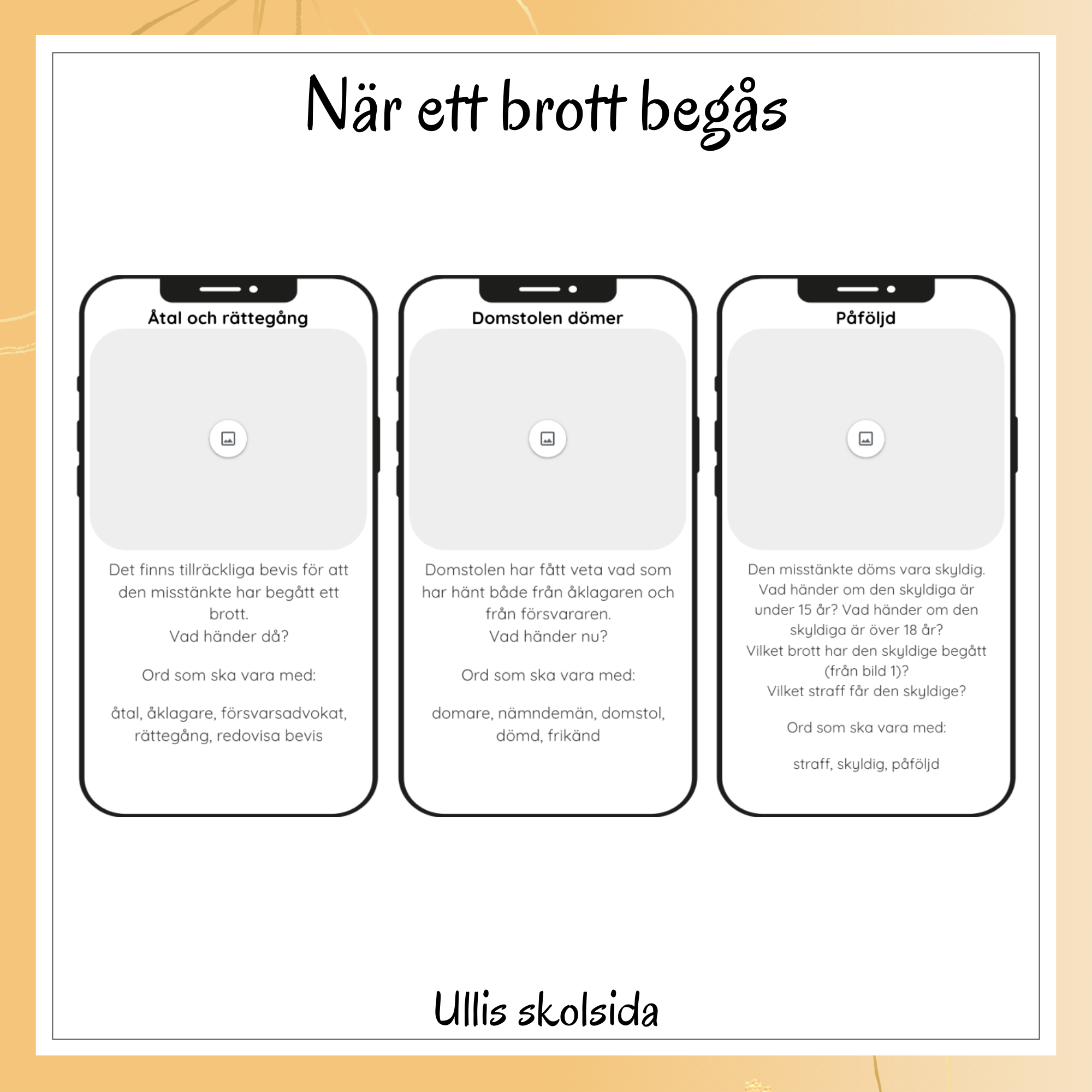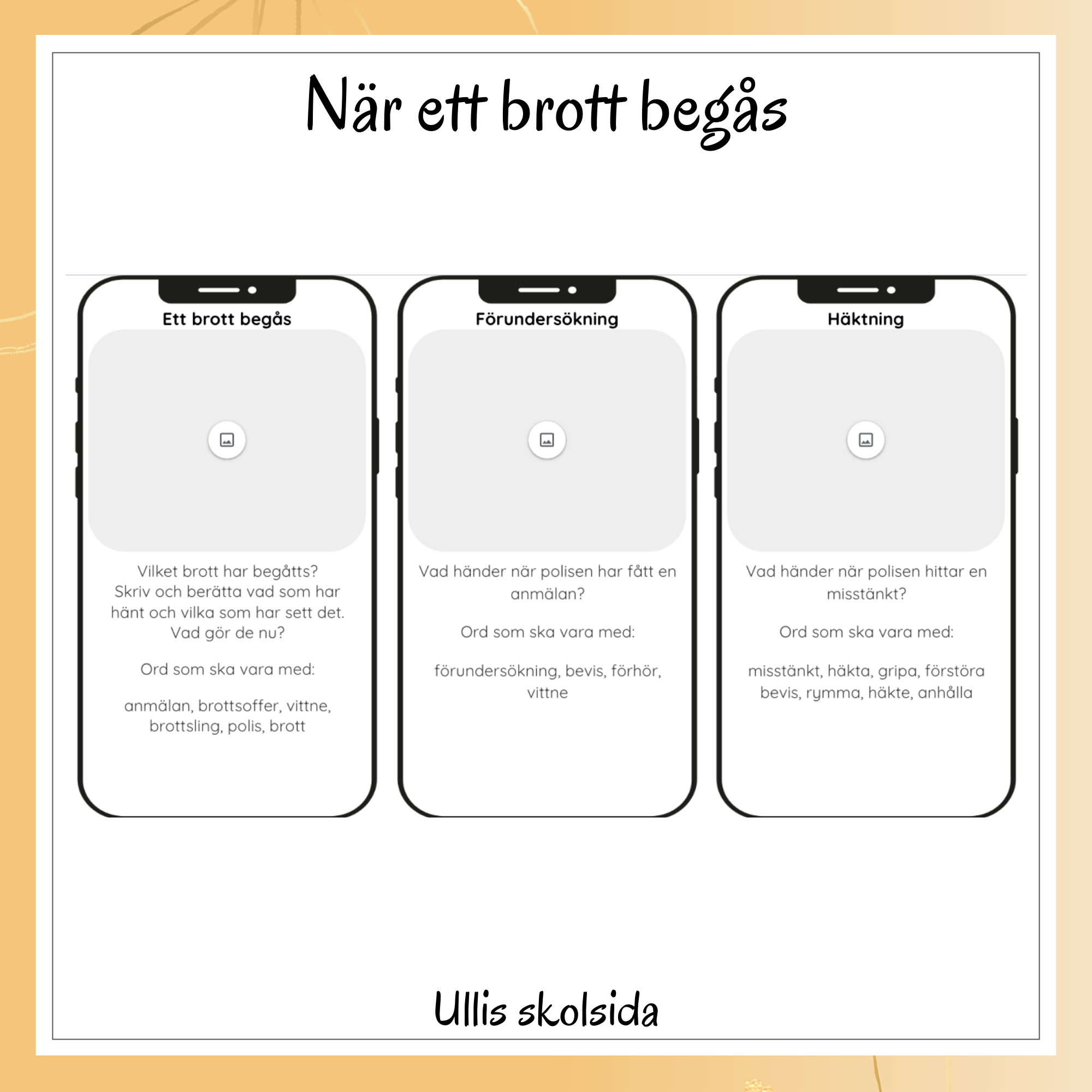 Vad händer när ett brott begås? Eleverna får sammanfatta rättsprocessen genom att skapa egna Instagraminlägg. Eleverna får 6 stycken Instagraminlägg med olika rubriker där de med hjälp av frågeställningarna och ämnesspecifika ord ska göra en kortare text som beskriver vad som händer i de olika stegen. Eleverna lägger också till bilder som passar deras inlägg.