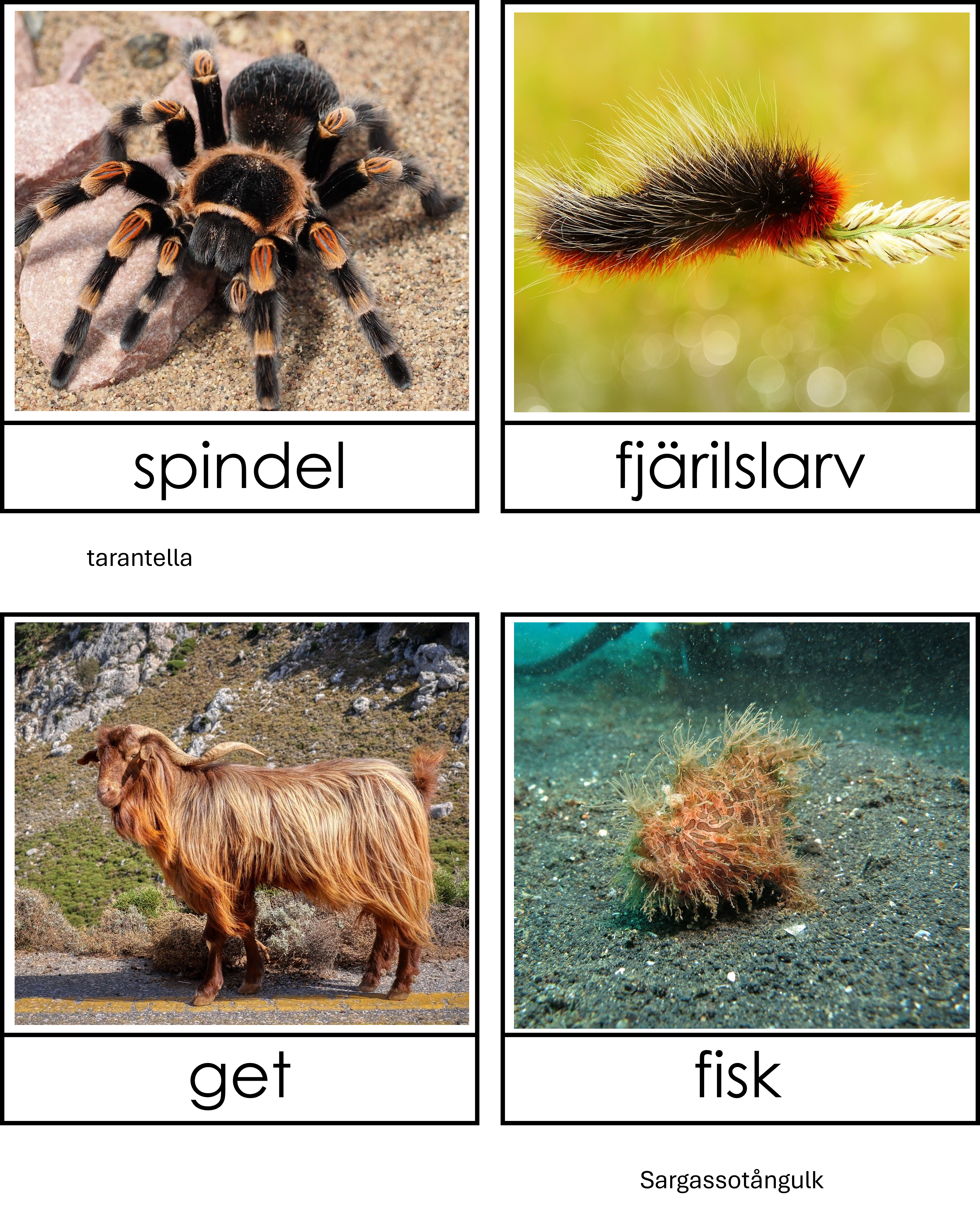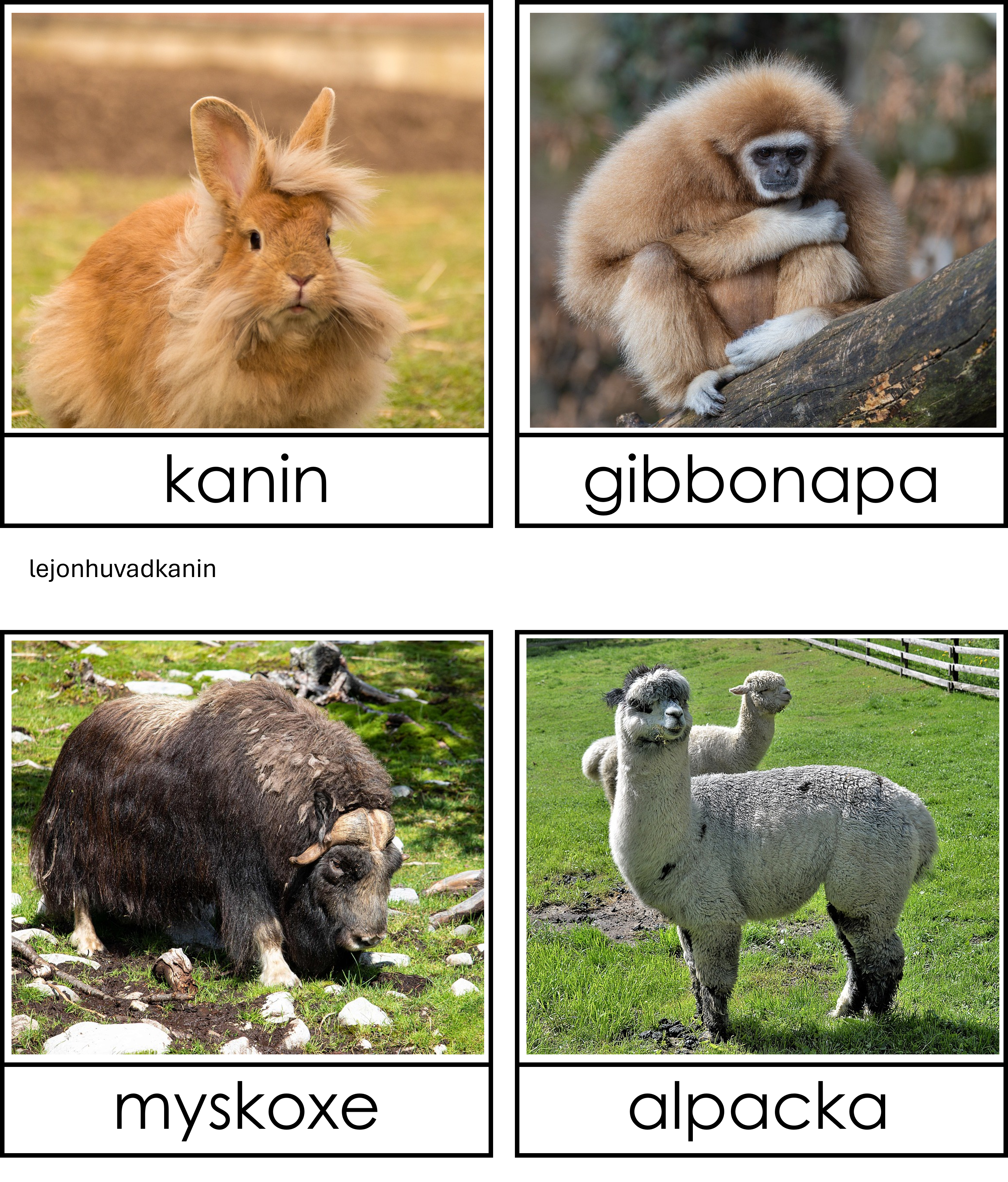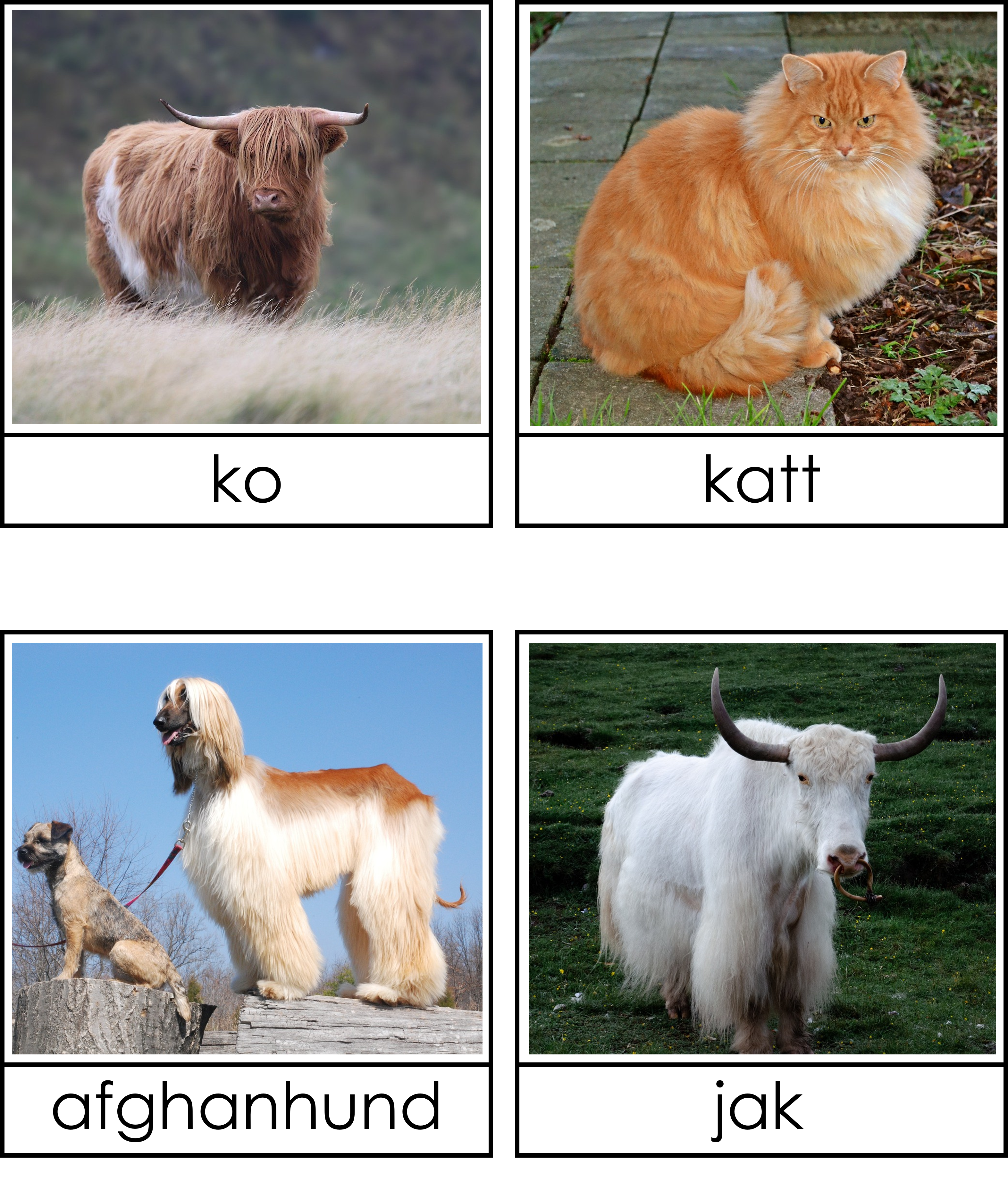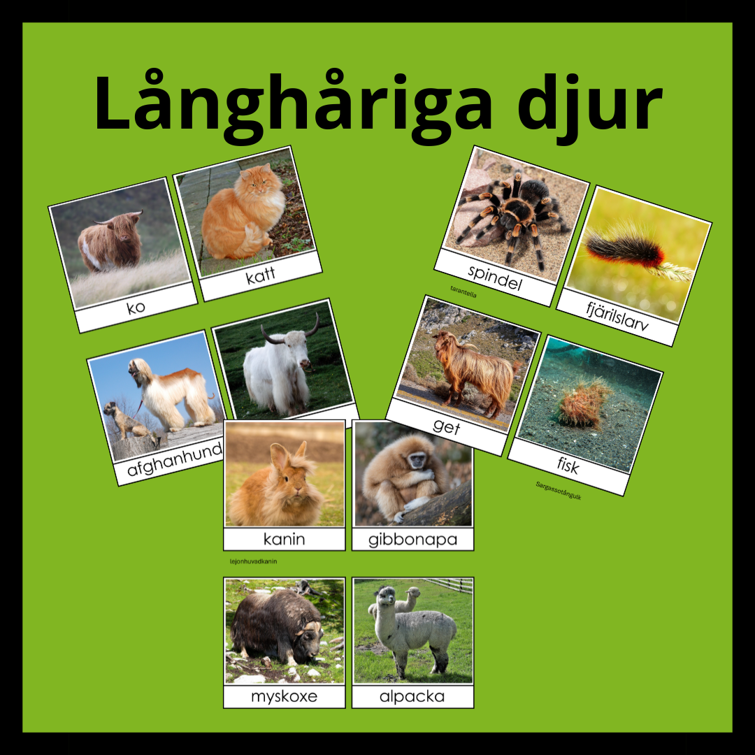Materialet används för att sortera djur. Dessa djur är långhåriga. Välj ett eller flera andra djurkort och låt barnet sortera och jämföra djuren tex randiga.