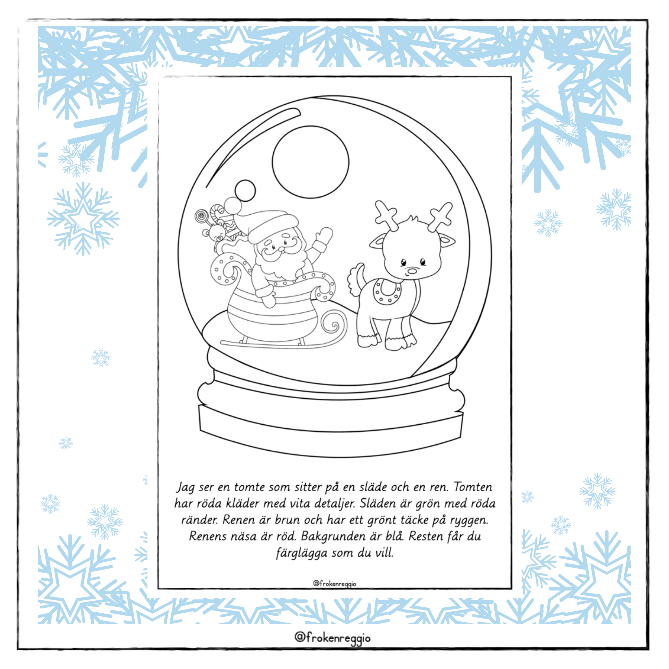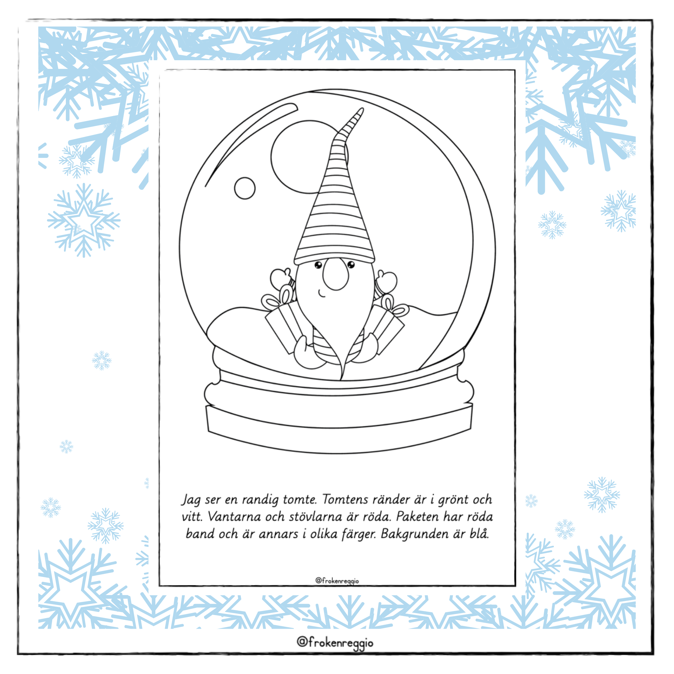 Läs och färglägg med jultema. 6 olika bilder och en tom snökula att färglägga som man vill eller varför inte göra egna instruktioner.