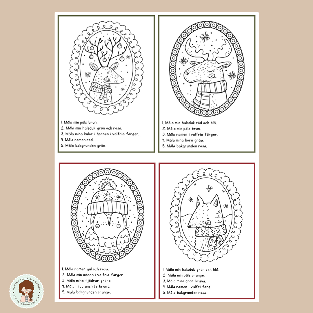 Läs och måla med 6 olika djurmotiv! En rolig övning för eleverna där de får träna både läsförståelse och förmågan att följa instruktioner. Läs  texten och måla enligt beskrivningarna. Ett perfekt sätt att göra lärandet både lärorikt och roligt under vintersäsongen!