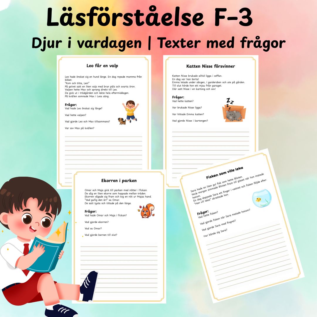 Läsförståelse – Djur i vardagen är ett lekfullt och lättanvänt häfte med 4 korta berättelser om djur, anpassade för elever i förskoleklass och årskurs 1–3.