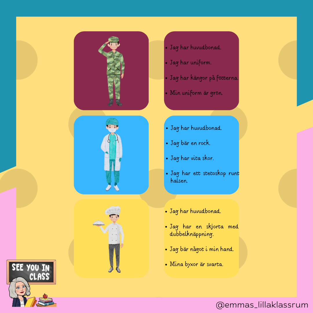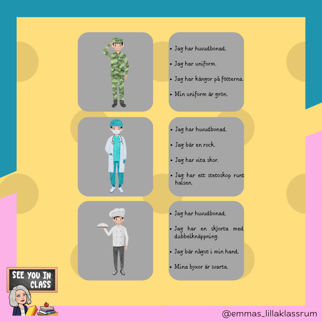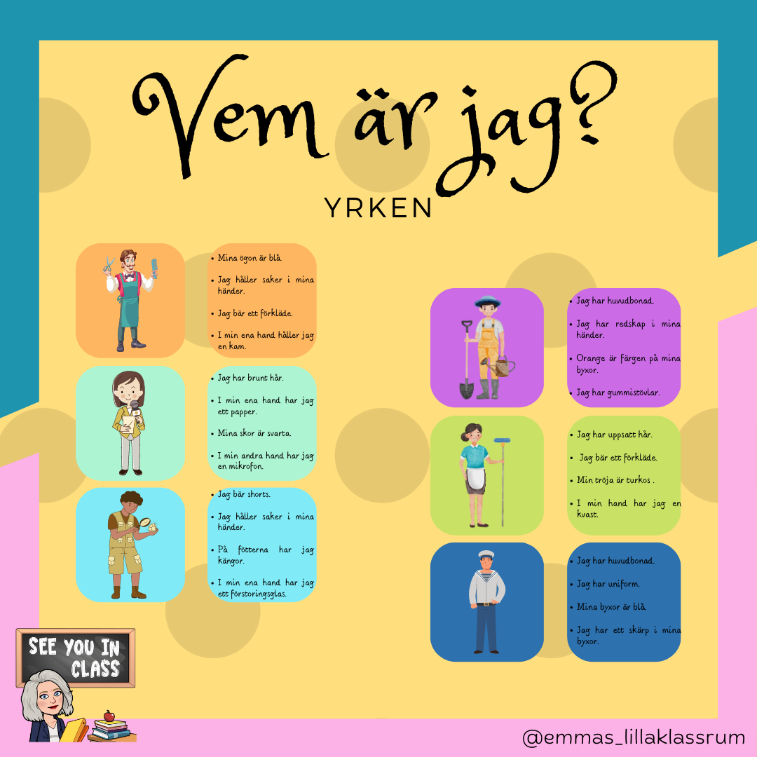 Materialet består av 15 par, där en är en bild och den andra består av ledtrådar för att lista ut vilket yrke texten beskriver. Materialet finns i två nivåer. En nivå där alla kort har samma bakgrundsfärg som gör att det blir svårare att finna vilka kort som bildar par. Den andra nivån har paret samma färg i bakgrunden för att underlätta att hitta paren. Materialet kan användas som ett memory för skapa en gemensam aktivitet, eller som en individuell uppgift kring läsförståelse. Eller använd materialet på de sättet som passar just din klass.