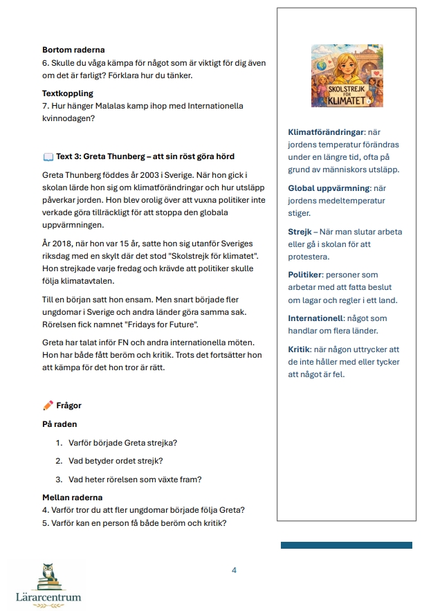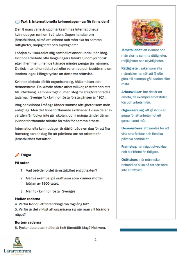 Detta läsförståelsehäfte är utformat för årskurs 4–6 och passar särskilt bra i samband med Internationella kvinnodagen den 8 mars eller arbete med jämställdhet och värdegrund.