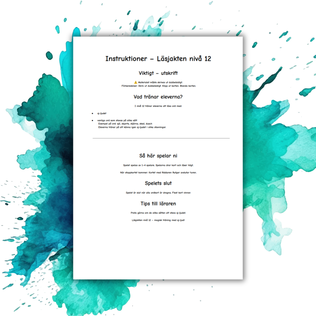 Läsjakten – nivå 12 är ett lekfullt och strukturerat kortspel som tränar elevernas avkodning av ord med sj-ljud. Materialet passar elever som kommit längre i sin läsutveckling och kan användas som stationsarbete, parövning eller enskilt arbete.