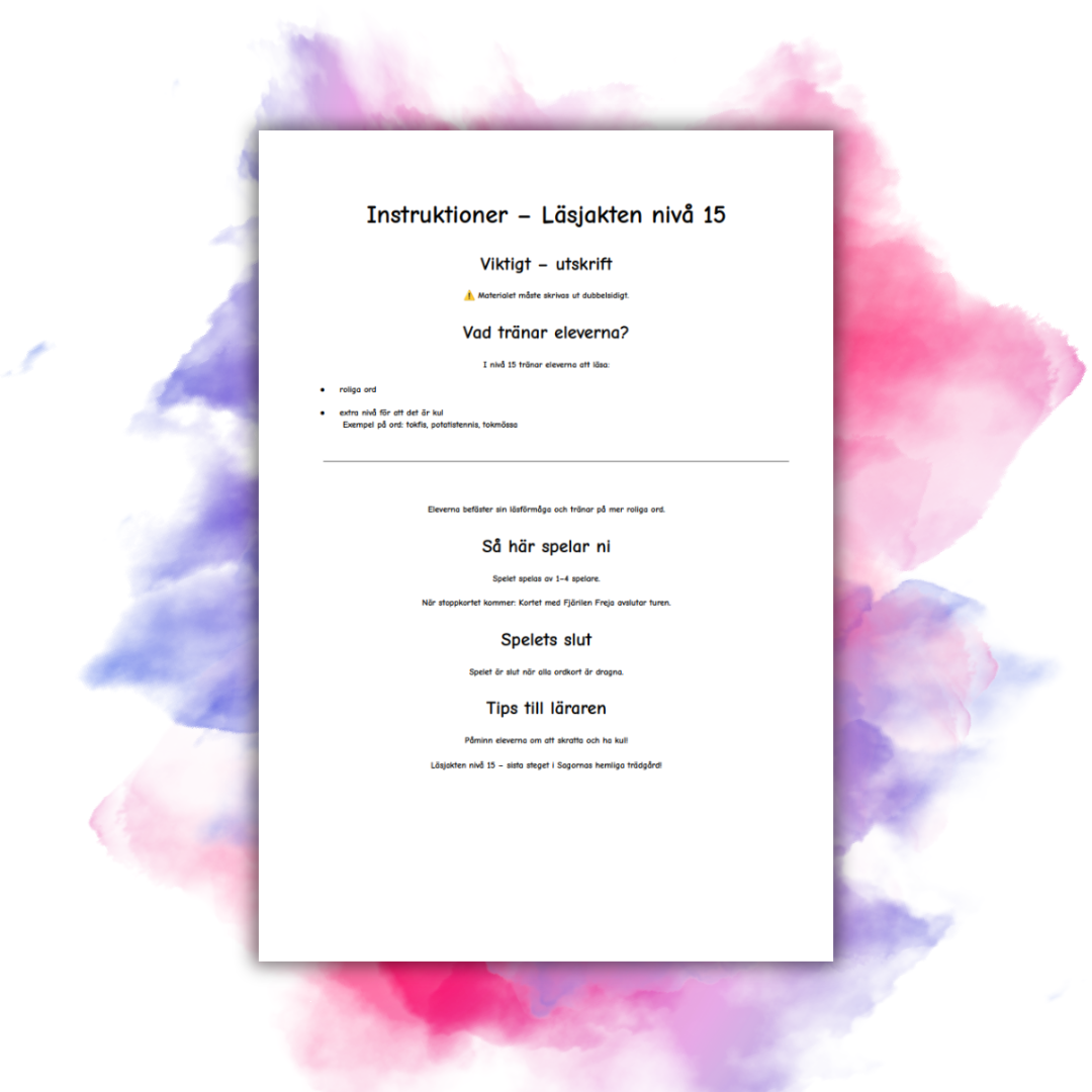 Läsjakten – nivå 15 är ett lekfullt och fantasifullt kortspel som bjuder in till skratt, läsglädje och språklig nyfikenhet. Den här nivån är en rolig extralevel där eleverna får läsa tokiga och påhittade sammansatta ord, samtidigt som de fortsätter befästa sin läsförmåga. Materialet passar perfekt som ett lustfyllt avslut eller som en motiverande paus i lästräningen och kan användas som stationsarbete, parövning eller enskilt arbete.