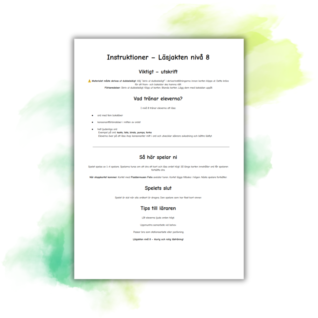 Läsjakten – nivå 8 är ett lekfullt och strukturerat kortspel som tränar elevernas avkodning av ljudenliga ord med fem bokstäver och konsonantförbindelser i mitten av ordet. Materialet passar elever som kommit längre i sin läsutveckling och kan användas som stationsarbete, parövning eller enskilt arbete.