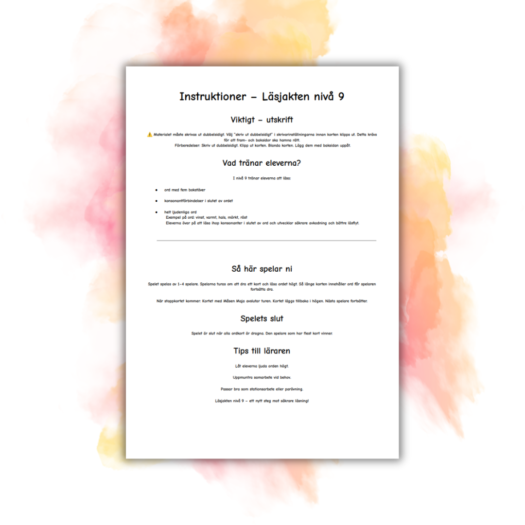Läsjakten – nivå 9 är ett lekfullt och strukturerat kortspel som tränar elevernas avkodning av ljudenliga ord med fem bokstäver och konsonantförbindelser i slutet av ordet. Materialet passar elever som kommit längre i sin läsutveckling och kan användas som stationsarbete, parövning eller enskilt arbete.